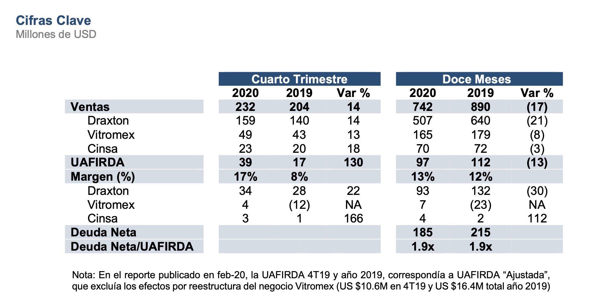 Respecto a su negocio de fundición y mecanizado para la industria automotriz Draxton, el reporte indica que durante el cuarto trimestre del año logró un crecimiento de 14% en ventas y 22% en UAFIRDA, respecto al mismo período del año anterior, como resultado de la recuperación de sus volúmenes en Norteamérica, Europa y China.