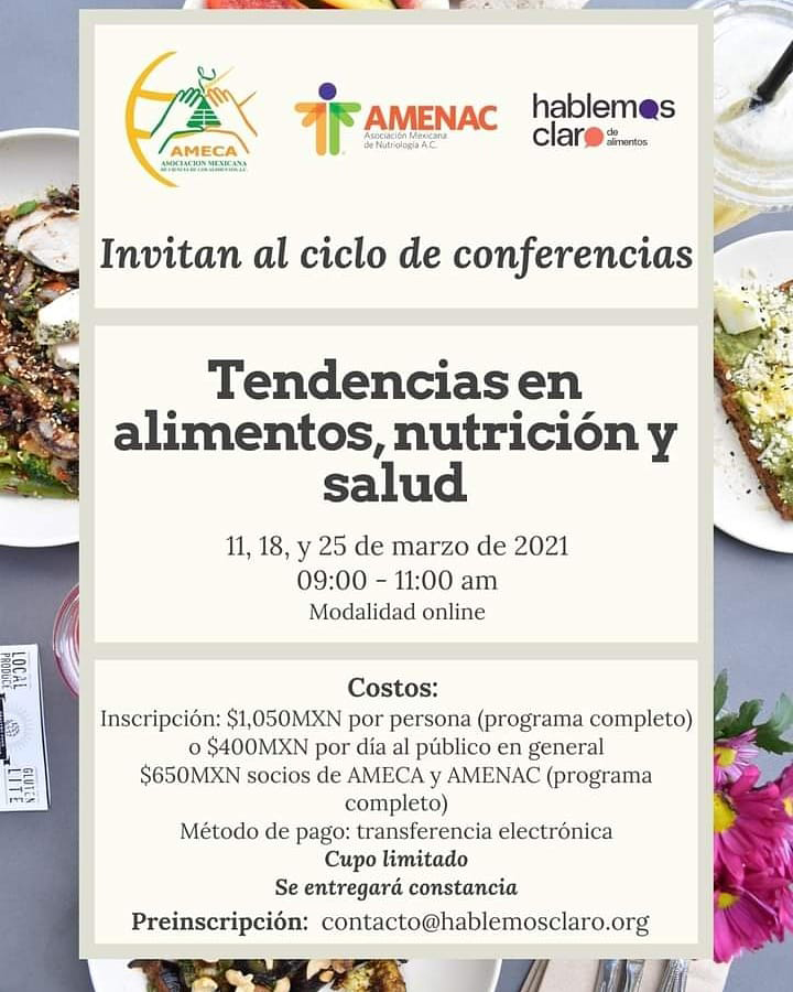 El ciclo de conferencias inicia el 11 de marzo de 9:00 a 11:00 horas con los temas “Proteínas de origen vegetal”, “Fibra dietética: un esencial de la alimentación”, “Grasas y aceites:¿cómo incluirlos correctamente en la dieta?, “Efectos biológicos y metabolismos de la vitamina D”; las ponencias para el día 18 son “Antioxidantes en la dieta”, “Alimentos fermentados: su importancia en la salud”, “Los aditivos como aliados para la salud” y “Hongos y microbiota intestinal”.
