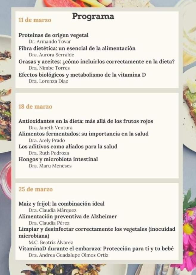 El 25 de marzo se presentan las charlas “Maíz y frijol: la combinación ideal”, “Alimentación preventiva de Alzheimer”, “Limpiar y desinfectar correctamente los vegetales (inocuidad microbiana)” y “Vitamina D durante el embarazo: Protección para ti y tu bebé”; al término del Ciclo, se entregará constancia de participación a los asistentes.