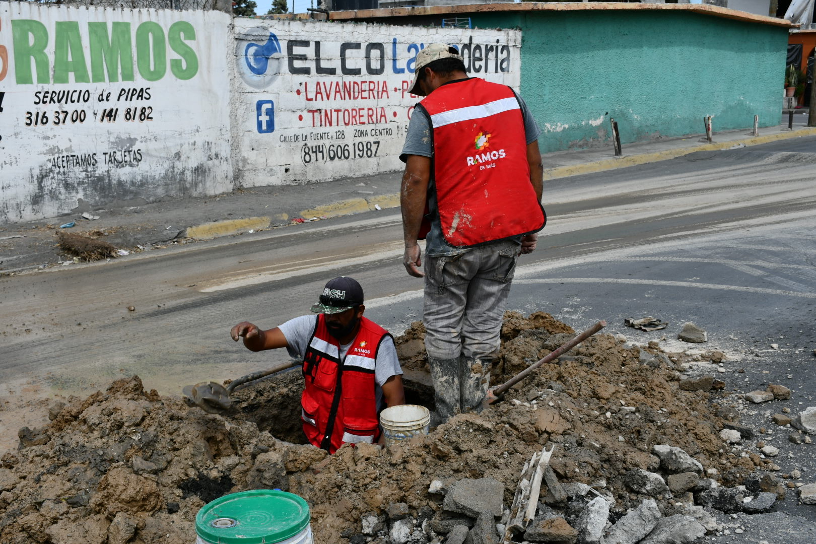 Una cuadrilla de la Compañía de Aguas de Ramos Arizpe (COMPARA) atiende una fuga de agua en una de las tomas ubicada en el cruce de la calle Margarita y Antiguo Camino a Monterrey en la colonia Santos Saucedo, al oriente de la ciudad.
