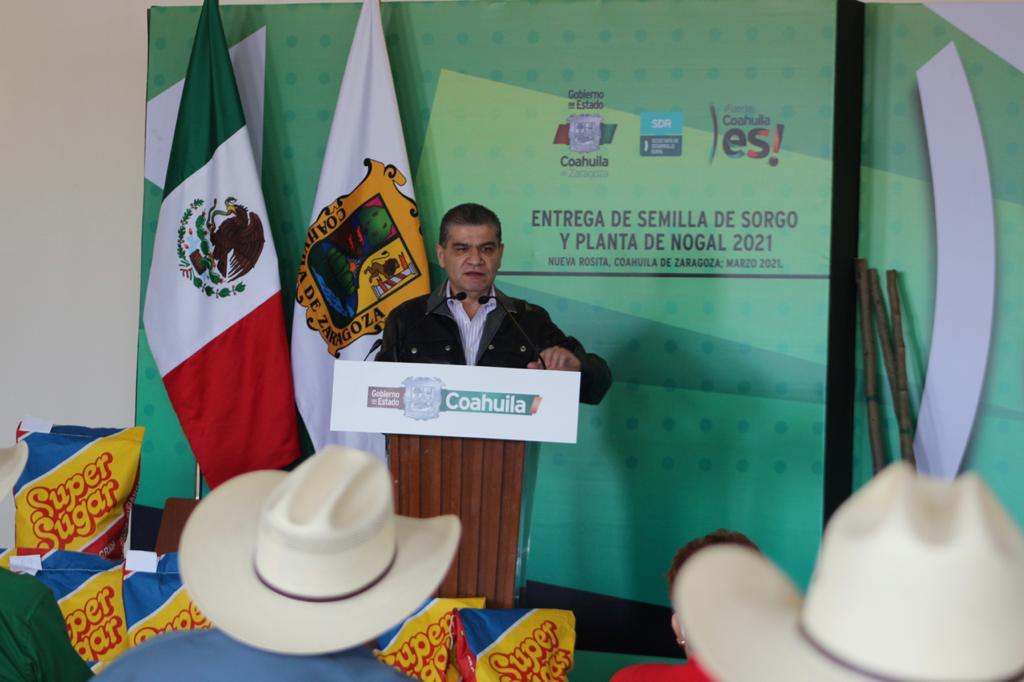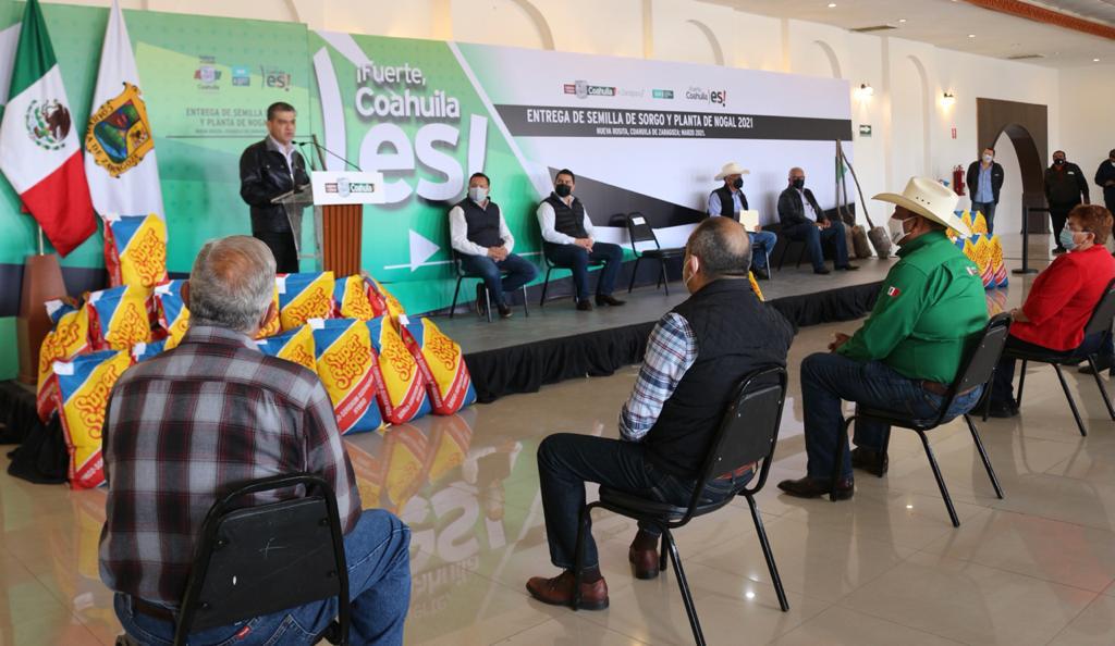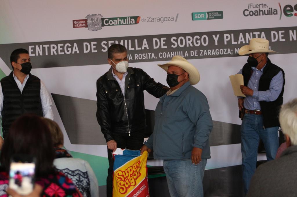 San Juan de Sabinas, Coahuila.- El gobernador Miguel Ángel Riquelme Solís entregó semilla de sorgo forrajero y mil 500 plantas de nogal para productores rurales de la Región Carbonífera.