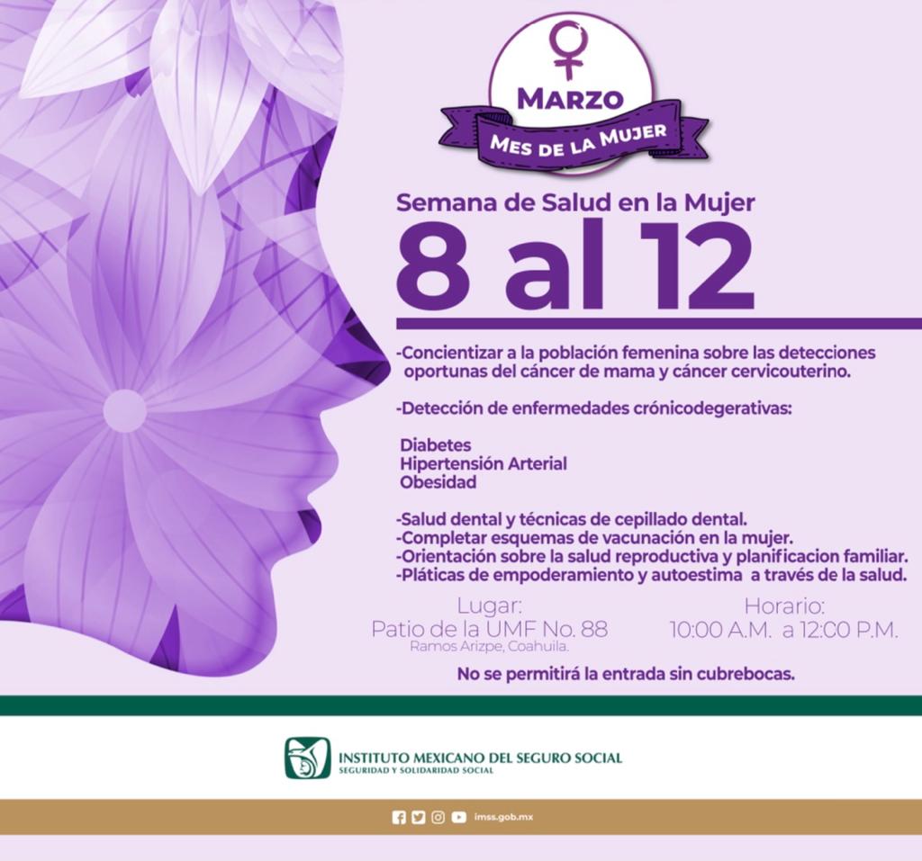 Para conmemorar el día internacional de la Mujer, la Unidad de Medicina Familiar (UMF) No. 88 del Instituto Mexicano del Seguro Social (IMSS) Coahuila, en Ramos Arizpe, llevará a cabo la Semana de Salud de la Mujer del 8 al 12 de marzo, en la cual habrá acciones preventivas, detecciones de cáncer de mama, cáncer cervicouterino y conferencias, todas ellas gratuitas para la población derechohabiente.