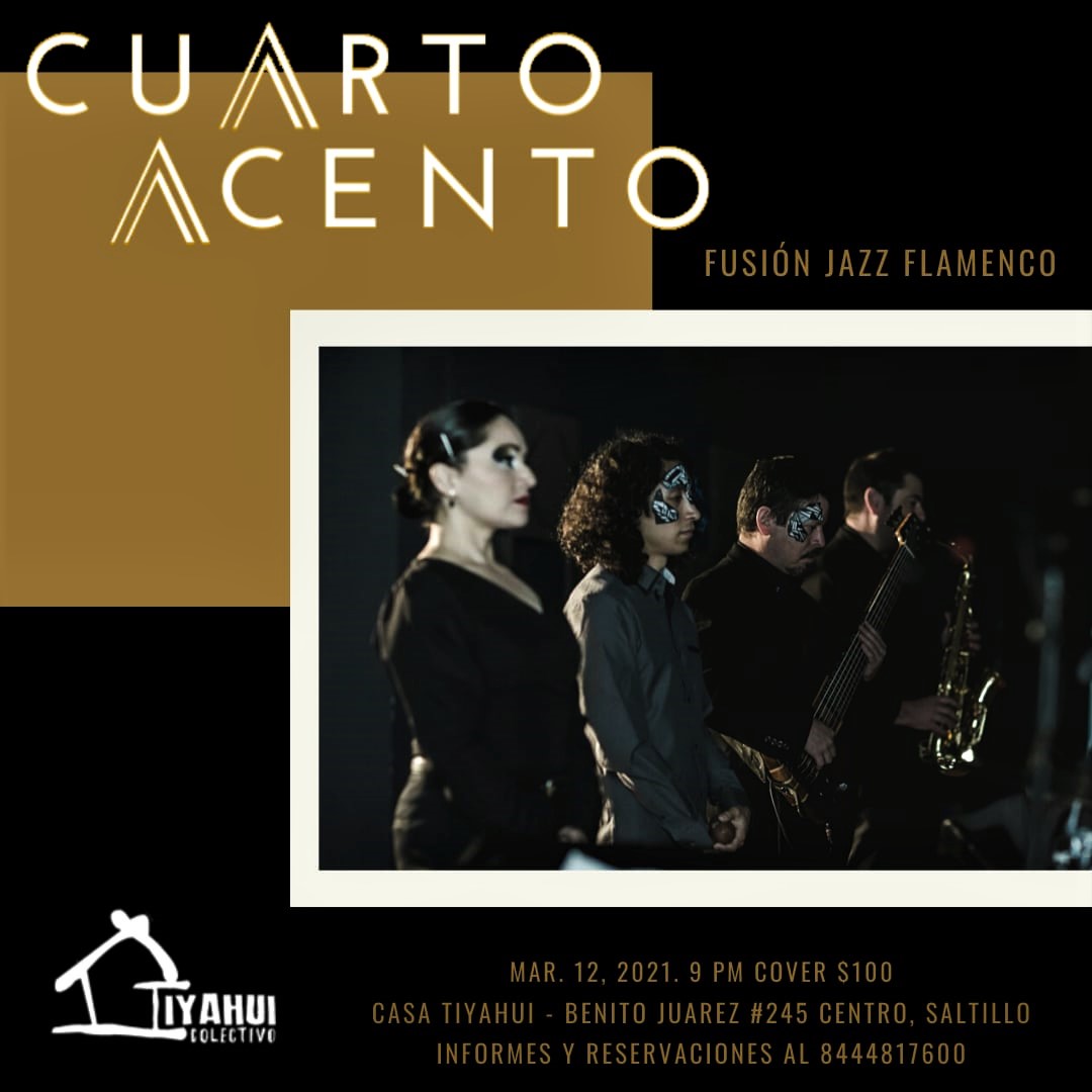 El próximo 12 de marzo, a las 9:00 de la noche, el ensamble «Cuarto Acento» presentará, en el espacio cultural independiente «Casa Tiyahui», un original espectáculo en el que se fusionan el jazz y el flamenco. Los boletos, con valor de $100.00 pesos por persona, y las reservaciones ya están disponibles llamando al teléfono 844 481 7600.