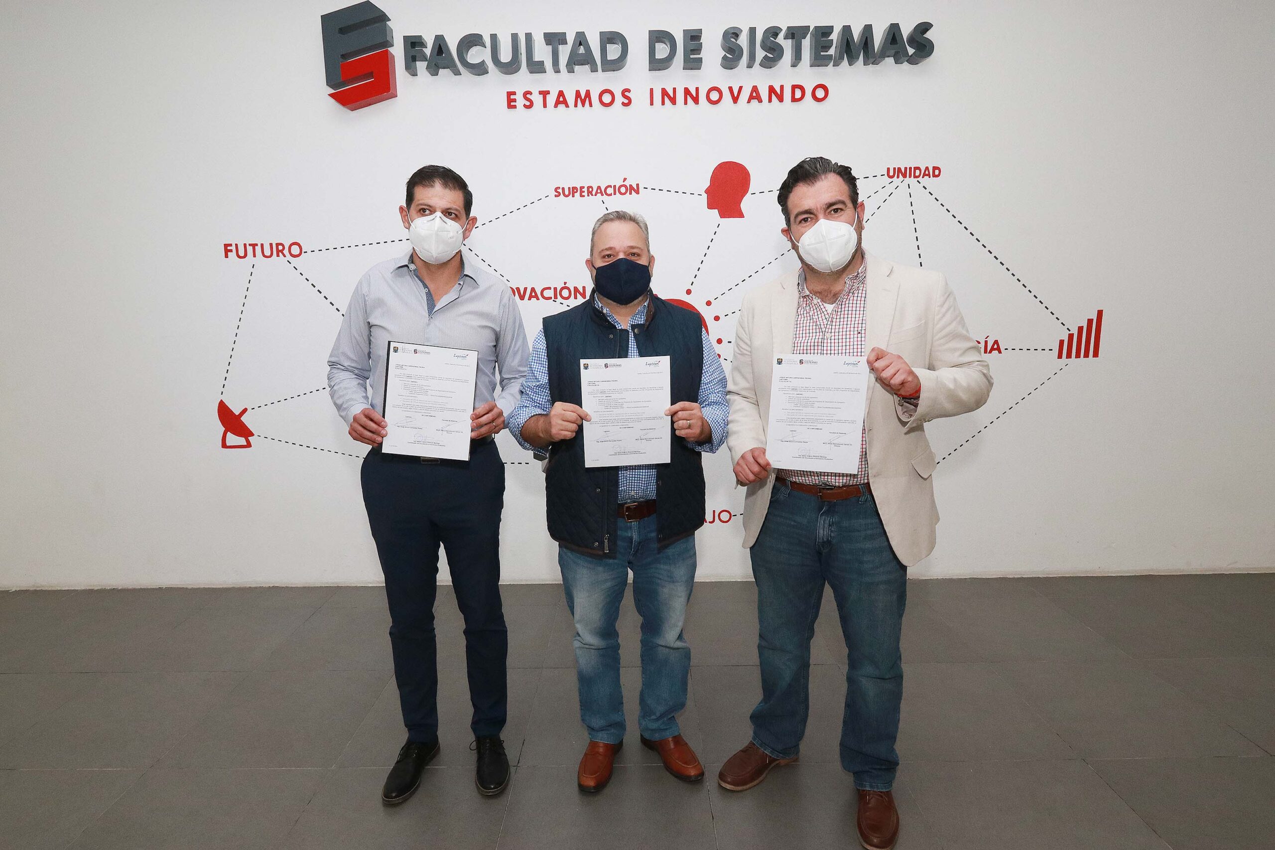 Durante la reunión en la cual se firmó el acuerdo se contó con la presencia del coordinador general de Vinculación e Innovación Productiva, Octavio Pimentel Martínez, el director de la Facultad de Sistemas, Jesús Rabindranath Galván Gil, y el director de la empresa Laptown, Jorge Arturo Larrazábal Piedra.