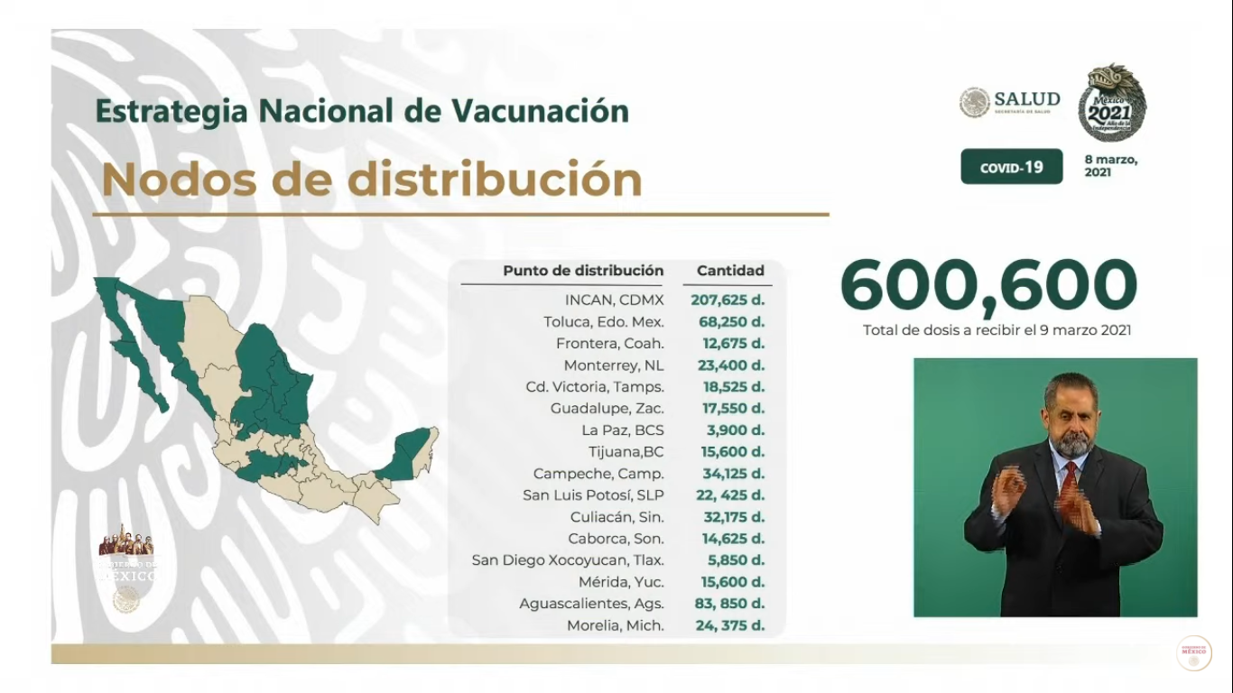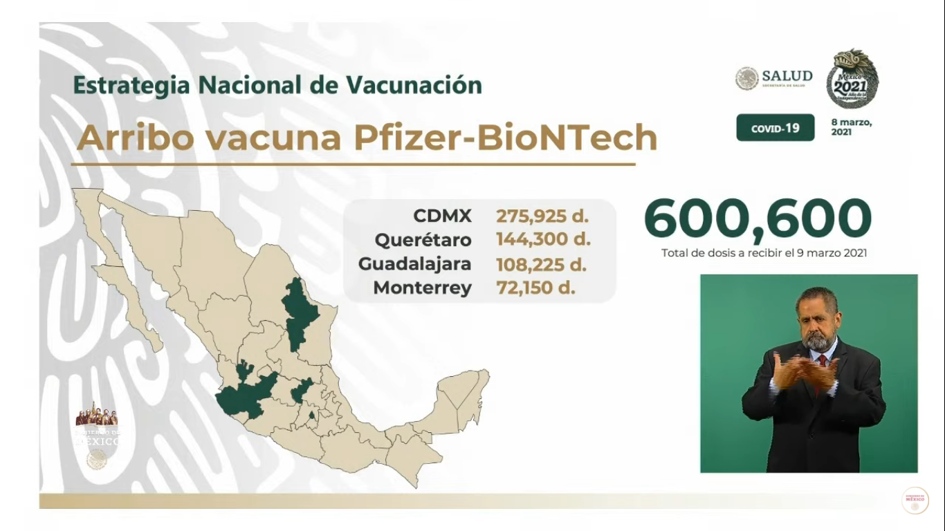 Ruy López Ridaura, director general del Centro Nacional de Programas Preventivos y Control de Enfermedades informó que las vacunas serán trasladadas en 16 nodos de ultra congelación para ser aplicadas en adultos mayores de 55 municipios urbanos, señaló que el próximo 16 de marzo se espera otro cargamento de cerca de 700 mil vacunas del mismo laboratorio. (EL HERALDO)