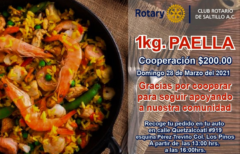 Con la misión de reunir fondos y traducirlos en despensas y aparatos ortopédicos para sectores vulnerables como personas con discapacidad y de bajos recursos, el Club Rotario de Saltillo Asociación Civil realizará, el próximo 28 de marzo, una venta de paella, con cooperación de $200.00 pesos por kilo.