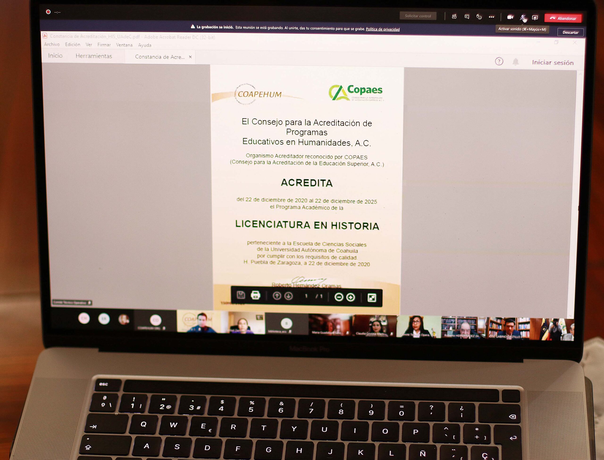 La Escuela de Ciencias Sociales de la Universidad Autónoma de Coahuila recibió de manera virtual la Constancia de Acreditación de la Licenciatura en Historia por parte del Consejo para la Acreditación de Programas Educativos en Humanidades (COAPEHUM).