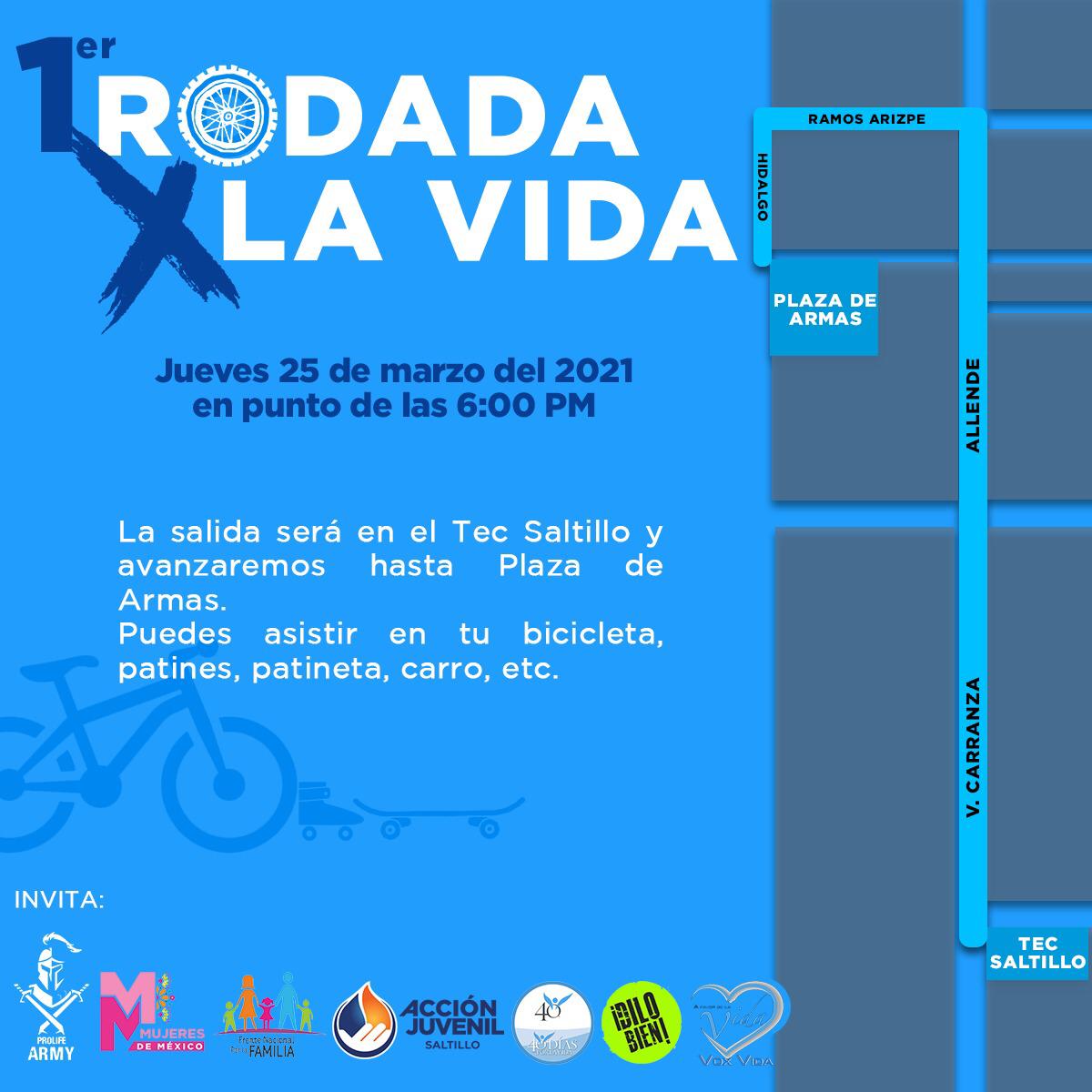 Organizado por el Movimiento ProLife Army, el próximo 25 de marzo, a partir de las 6:00 de la tarde, se efectuará el evento «Rodada por la Vida», con el que se planea realizar un recorrido en bicicleta, patines, patinetas, vehículos o a pie, desde el Instituto Tecnológico de Saltillo (ITS) hasta Plaza de Armas, con la finalidad de concientizar sobre la importancia de pronunciarse en contra del aborto y a favor del nacimiento.