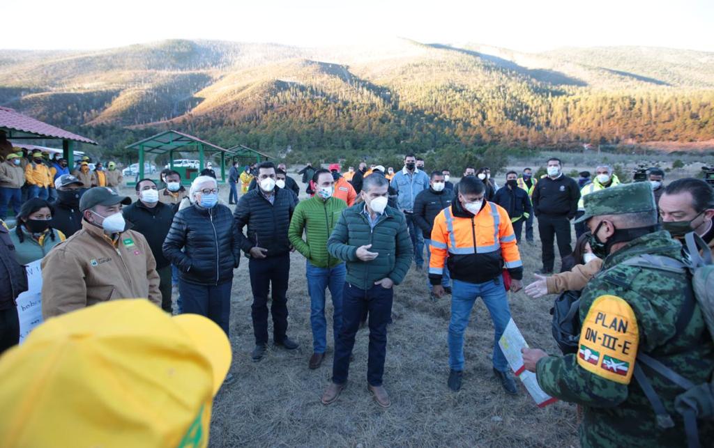 Acompañado por Eglantina Canales Gutiérrez, Secretaria de Medio Ambiente del Estado (SMA); Everardo Durán Flores, Alcalde de Arteaga; y Manolo Jiménez Salinas, Alcalde de Saltillo, así como por personal del Ejército Mexicano, Riquelme Solís escuchó en voz de Jorge Guerrero, Director de Vida Silvestre y Recursos Forestales de la SMA, el informe del primer día de combate al incendio forestal, así como las acciones a seguir para esta jornada.