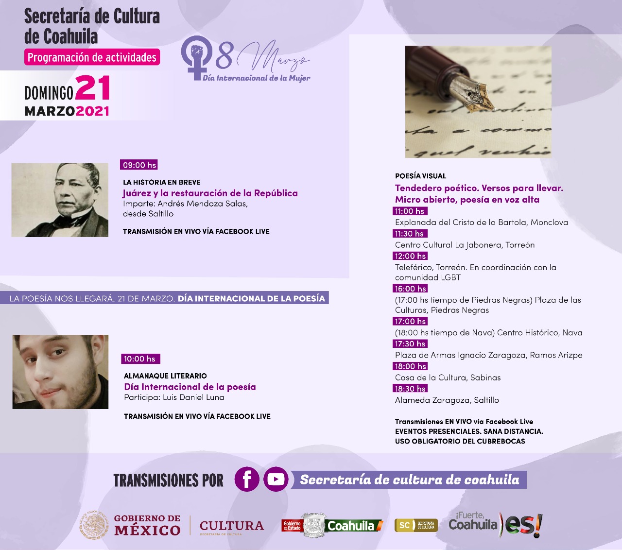 La Secretaría de Cultura coahuilense (SC) celebrará el Día Mundial de la Poesía el 21 de marzo, y habrá distintas actividades en formato hibrido, esto en distintos municipios de la entidad.