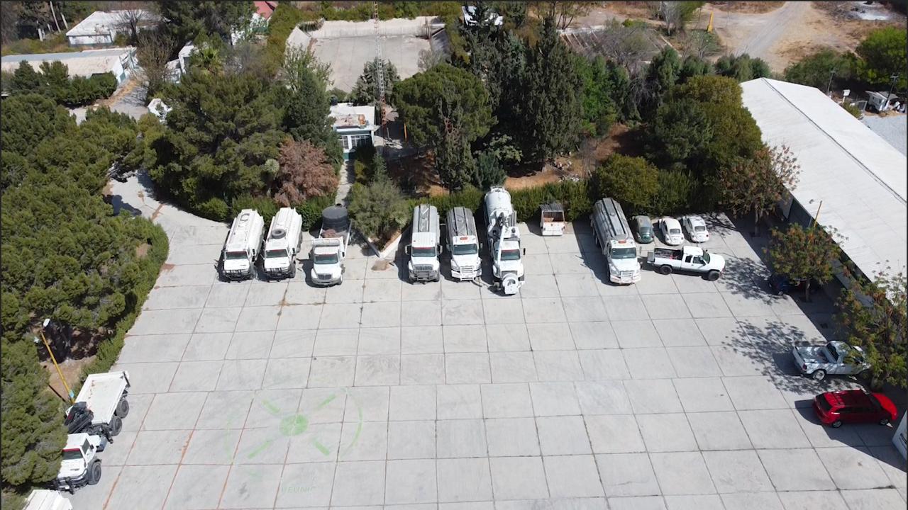 En el patio que sirve como corralón se encuentran al menos siete camiones cisterna todoterreno resguardados, así como un remolque cisterna y cuatro camiones de plataforma de la dependencia federal que se especializa en este tipo de desastres.