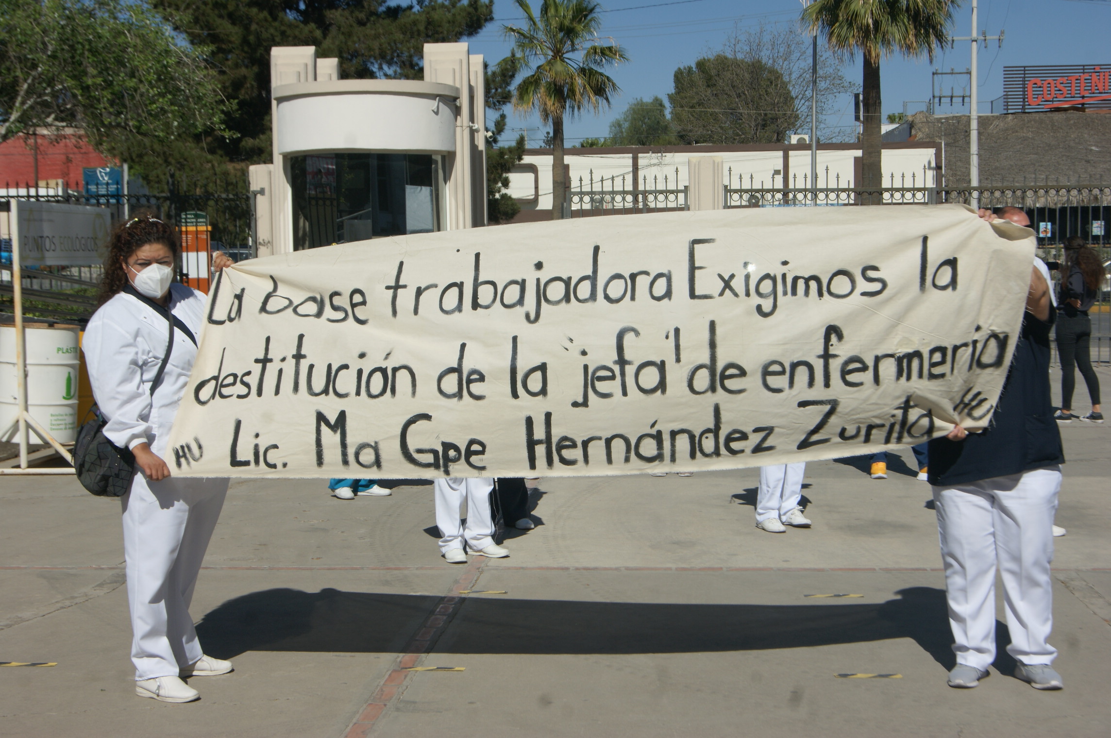 La mañana de este jueves, decenas de trabajadores de Enfermería del Hospital Universitario de Saltillo se congregaron en la sede de la Rectoría de la Universidad Autónoma de Coahuila (UA de C) para pedir la destitución de la jefa de esta área, María Guadalupe Hernández Zurita, por presuntas arbitrariedades cometidas en su contra.