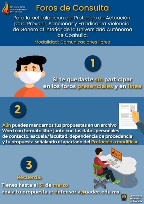 La Defensoría de los Derechos Humanos Universitarios de la Universidad Autónoma de Coahuila informa a la comunidad universitaria que aún pueden participar en el Proceso de Actualización del Protocolo para Prevenir, Sancionar y Erradicar la Violencia de Género al Interior de la UA de C, por lo que se les invita a enviar sus propuestas en la modalidad “Comunicaciones Libres” a más tardar el 31 de marzo de 2021.