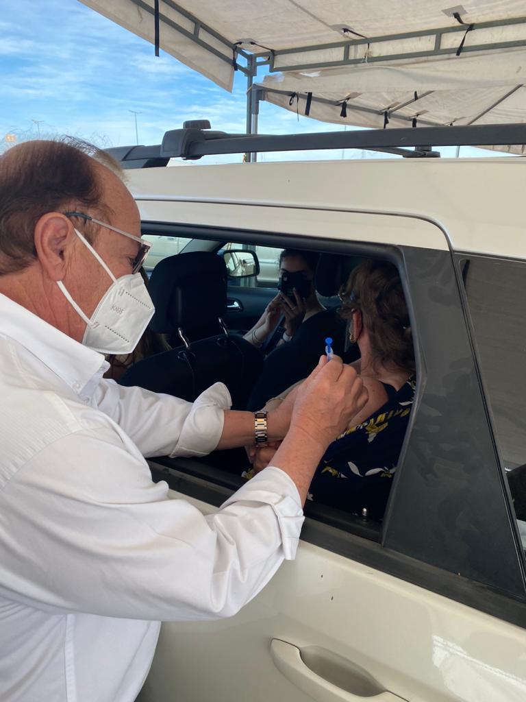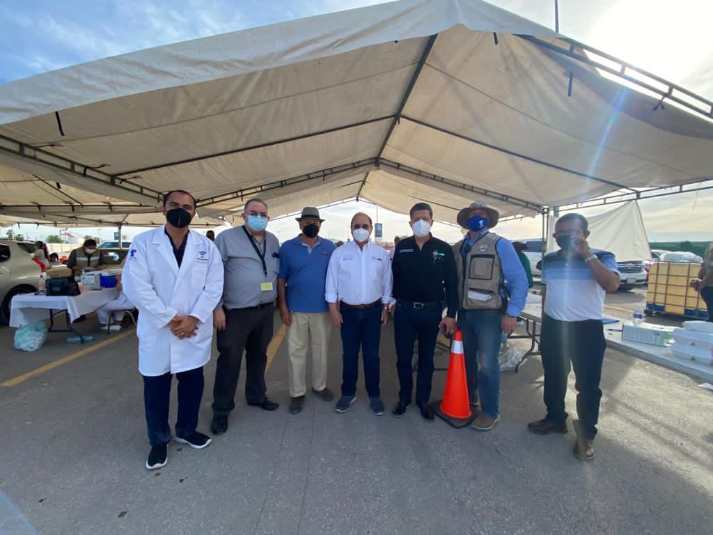 Acompañado por el jefe de la Jurisdicción Sanitaria No. 6, Juan Pérez Ortega, el funcionario dialogó con los adultos mayores que acudieron a las instalaciones del Coliseo Centenario de Torreón y aplicó algunas dosis en el “drive thru”.
