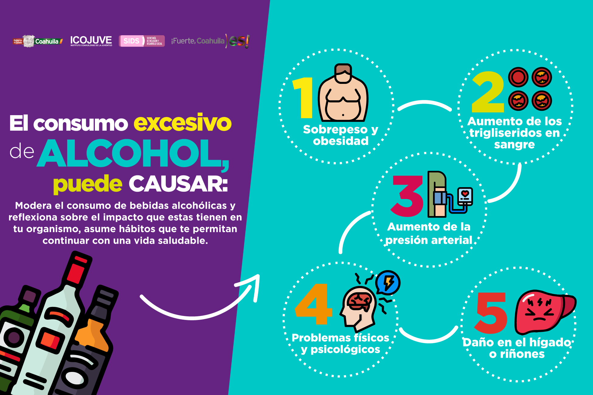 Graciela del Bosque, coordinadora de Atención Nutricional del ICOJUVE, mencionó que el alto consumo de alcohol produce la acumulación de grasa abdominal y el aumento de la testosterona y de los niveles de cortisol en la sangre, dando pie al desarrollo del sobrepeso, obesidad y otras enfermedades crónicas degenerativas, tales como la diabetes, complicaciones cardiovasculares y daños en diversos órganos, particularmente el hígado.