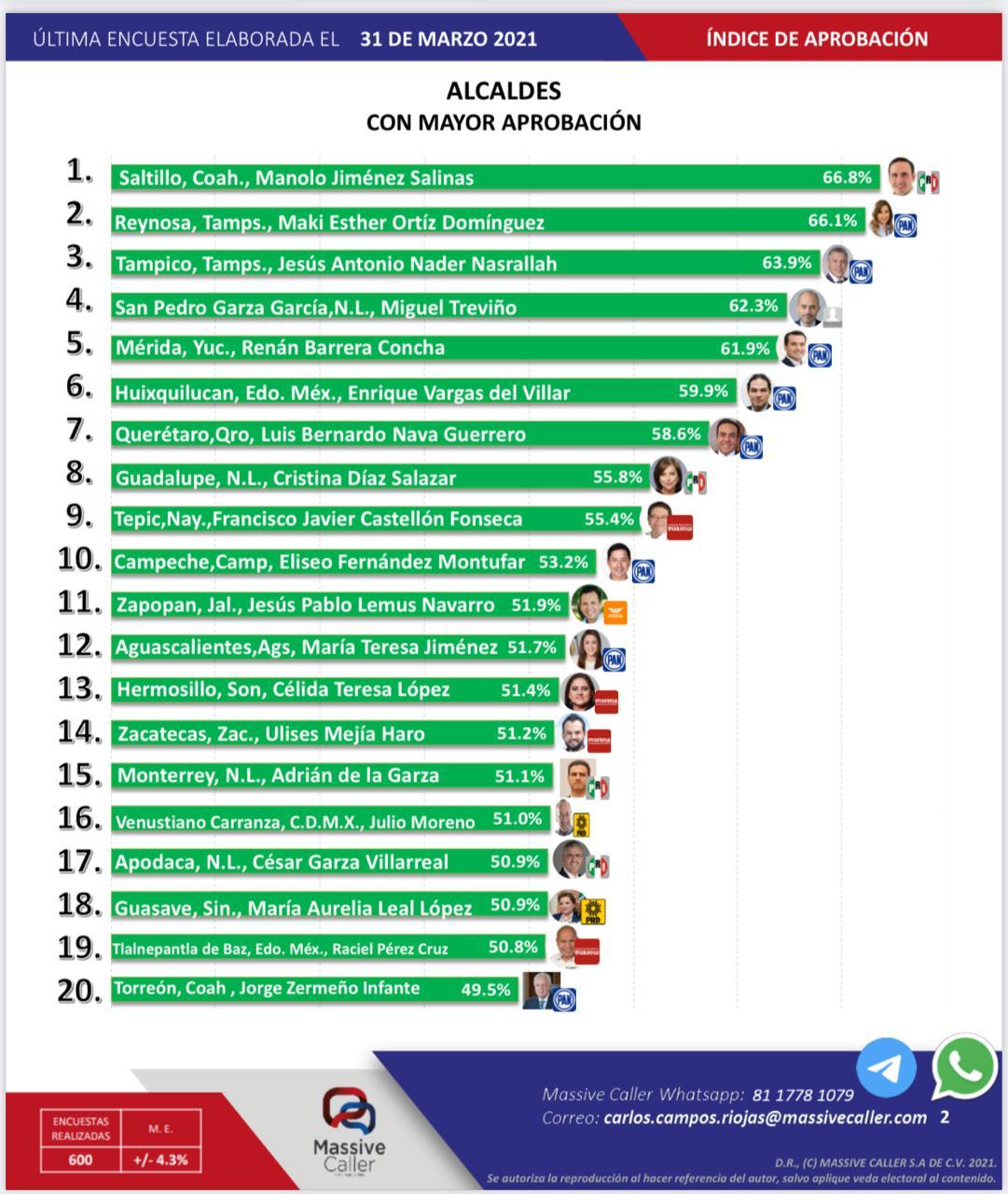En el top 5 se encuentran también los alcaldes de Reynosa, Tampico, San Pedro Garza García y Mérida.
