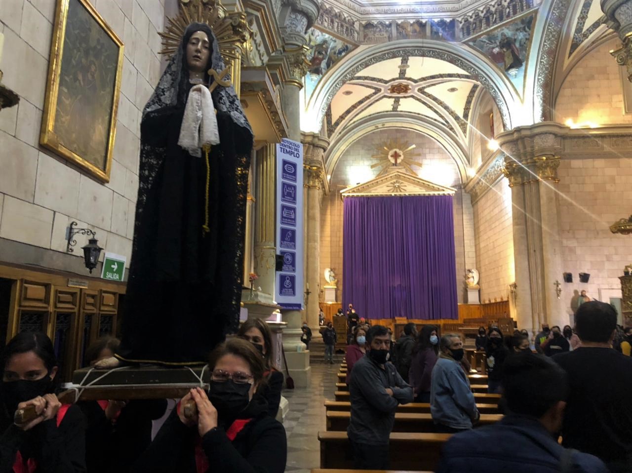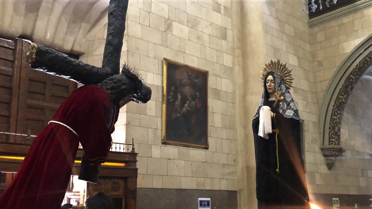 Una figura de Jesús cargando la Cruz y otra de la Virgen María, que feligreses tomaron en hombros para trasladarlas por espacios de la Catedral, emularon este pasaje dentro del Viernes Santo, recordado también por los creyentes como el día en el que Jesús, tras morir y ser bajado de la cruz, fue sepultado.