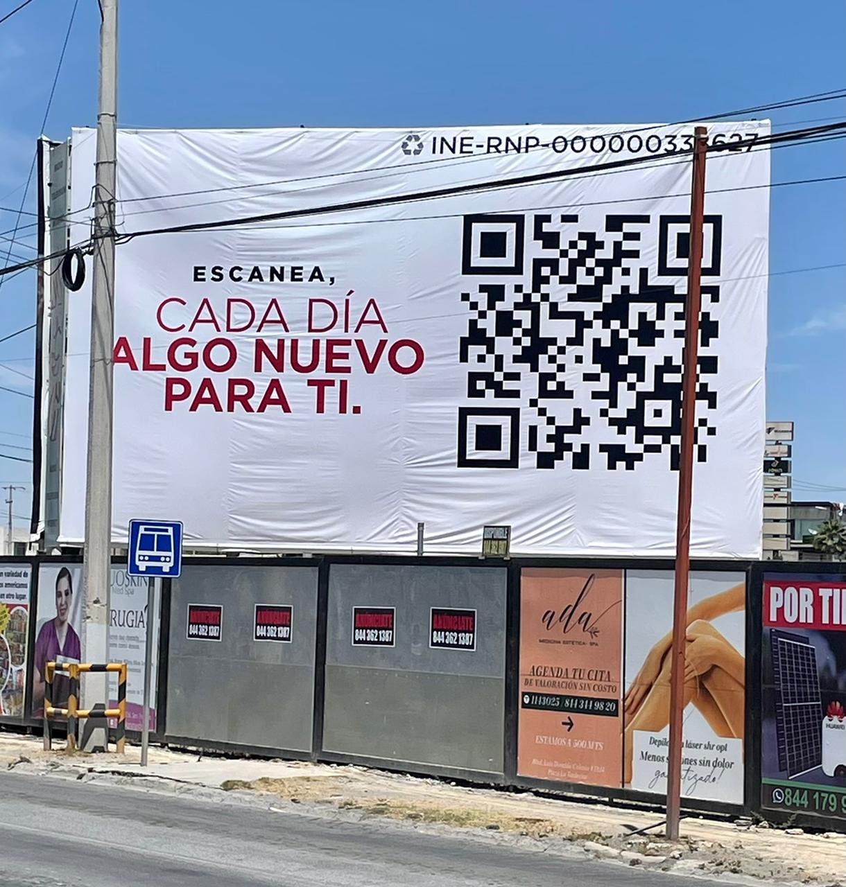 Ubicado en el cruce del bulevar José Musa de León y Luis Donaldo Colosio, al norte de Saltillo Capital, este espectacular invita a la ciudadanía a escanear por medio del teléfono celular el Código QR plasmado en él.