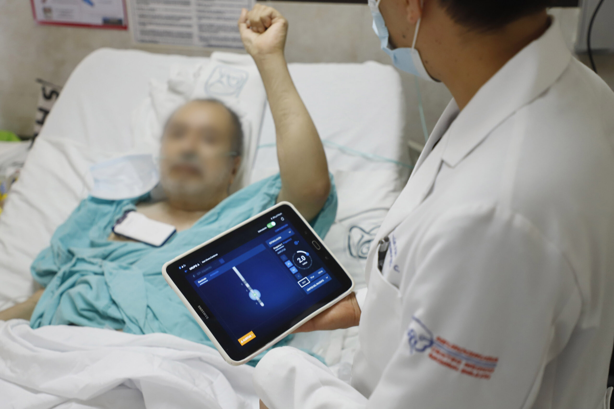 El señor Mario es monitoreado periódicamente mediante una tableta electrónica para conocer el estado de la batería del electrodo y del estimulador, además de realizarle pruebas físicas para valorar el progreso del procedimiento.