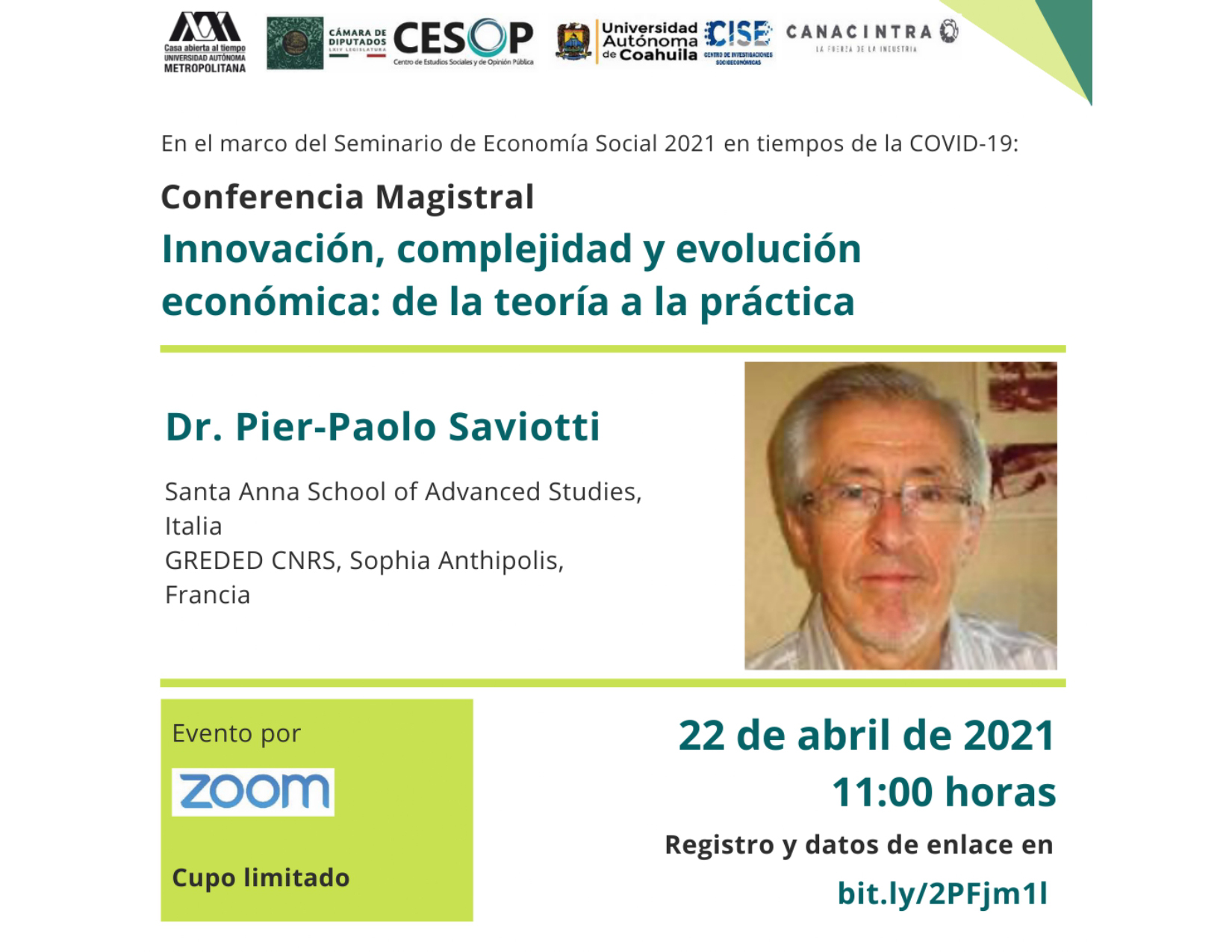 La charla “Innovación, complejidad y evolución económica: de la teoría a la práctica” será presentada por el catedrático de la Santa Anna School of Advanced Studies de Pisa, Italia e investigador del Centro Nacional de Investigaciones Científicas (CNRS) de Francia, Pier-Paolo Saviotti.