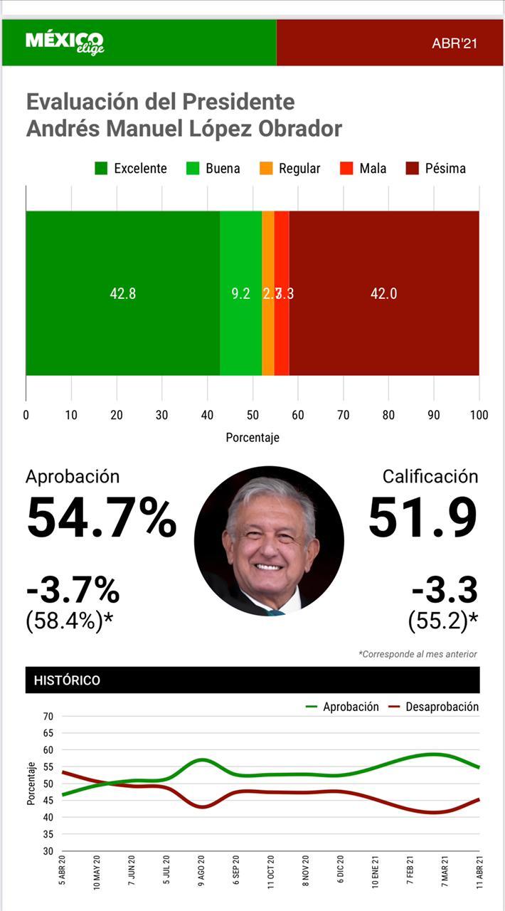 De acuerdo con el Estudio Nacional de Opinión Pública elaborado por la Asociación México Elige con fecha del 11 de abril de 2021, la aprobación del presidente Andrés López sufrió una caída de 3.7% en un mes, al pasar del 58.4% que tenía en marzo a un 54.7%. A la vez, su calificación cayó también 3.3%, de un 55.2% en marzo a un 51.9% en abril.