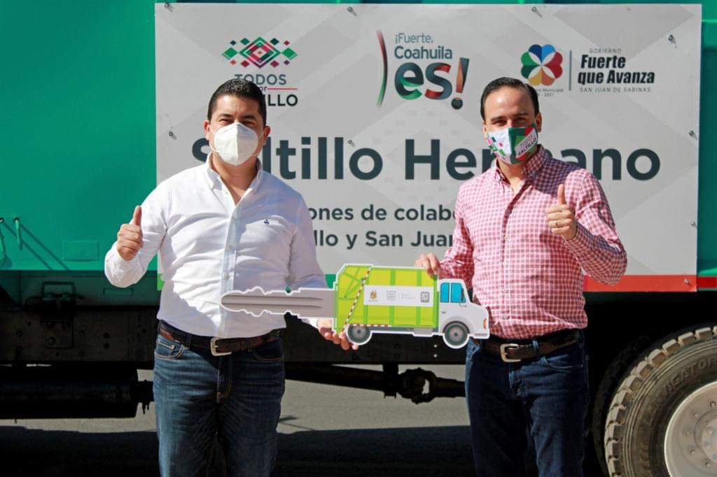El alcalde Manolo Jiménez Salinas continúa fortaleciendo el programa Saltillo Hermano y, en esta ocasión, firmó un convenio de colaboración con el municipio de San Juan Sabinas, localidad a la que se le donó un camión recolector de basura.