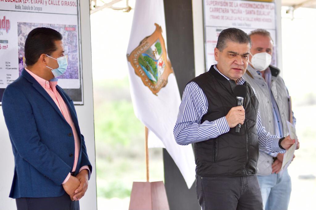 En gira de trabajo por el Municipio de Acuña, Riquelme Solís supervisó diversos tramos de la modernización de la Carretera Santa Eulalia, en su segunda etapa, con la meta de pavimentación de 34 mil 786 metros cuadrados, obra pactada a través del Impuesto Sobre Nómina (ISN).