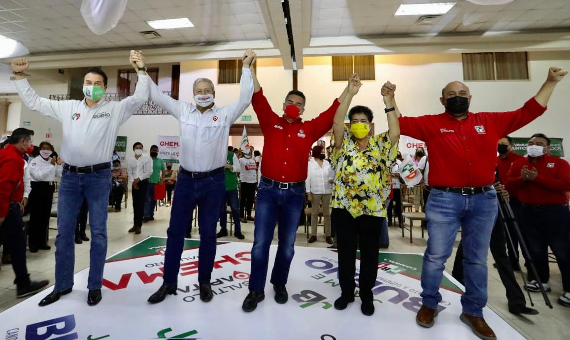 Acompañado por Rodrigo Fuentes Ávila, presidente del Comité Directivo Estatal del PRI Coahuila, así como de Jaime Bueno Zertuche, candidato a Diputado Federal por el distrito 7 y por Mary Telma Guajardo, líder estatal del PRD, Alejandro Moreno se refirió al trabajo responsable por parte del gobierno coahuilense.