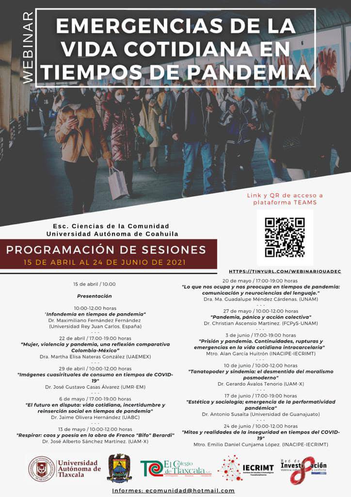El 29 de abril de 10:00 a 12:00 horas se impartirá la conferencia “Imágenes cuasi rituales de consumo en tiempos de Covid-19” a cargo del Dr. José Gustavo Casas de UMR-EM; por otro lado, el 6 de mayo de 17:00 a 19:00 horas se llevará a cabo la charla “El futuro en disputa: vida cotidiana, incertidumbre y reinserción social en tiempos de pandemia” por el Dr. Jaime Olivera Hernández de la Universidad Autónoma de Baja California.