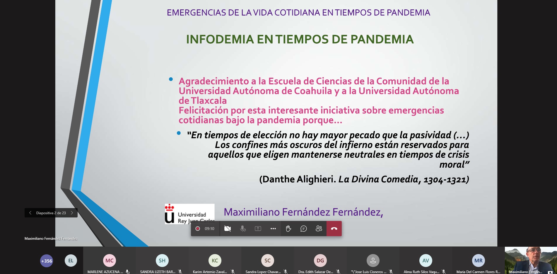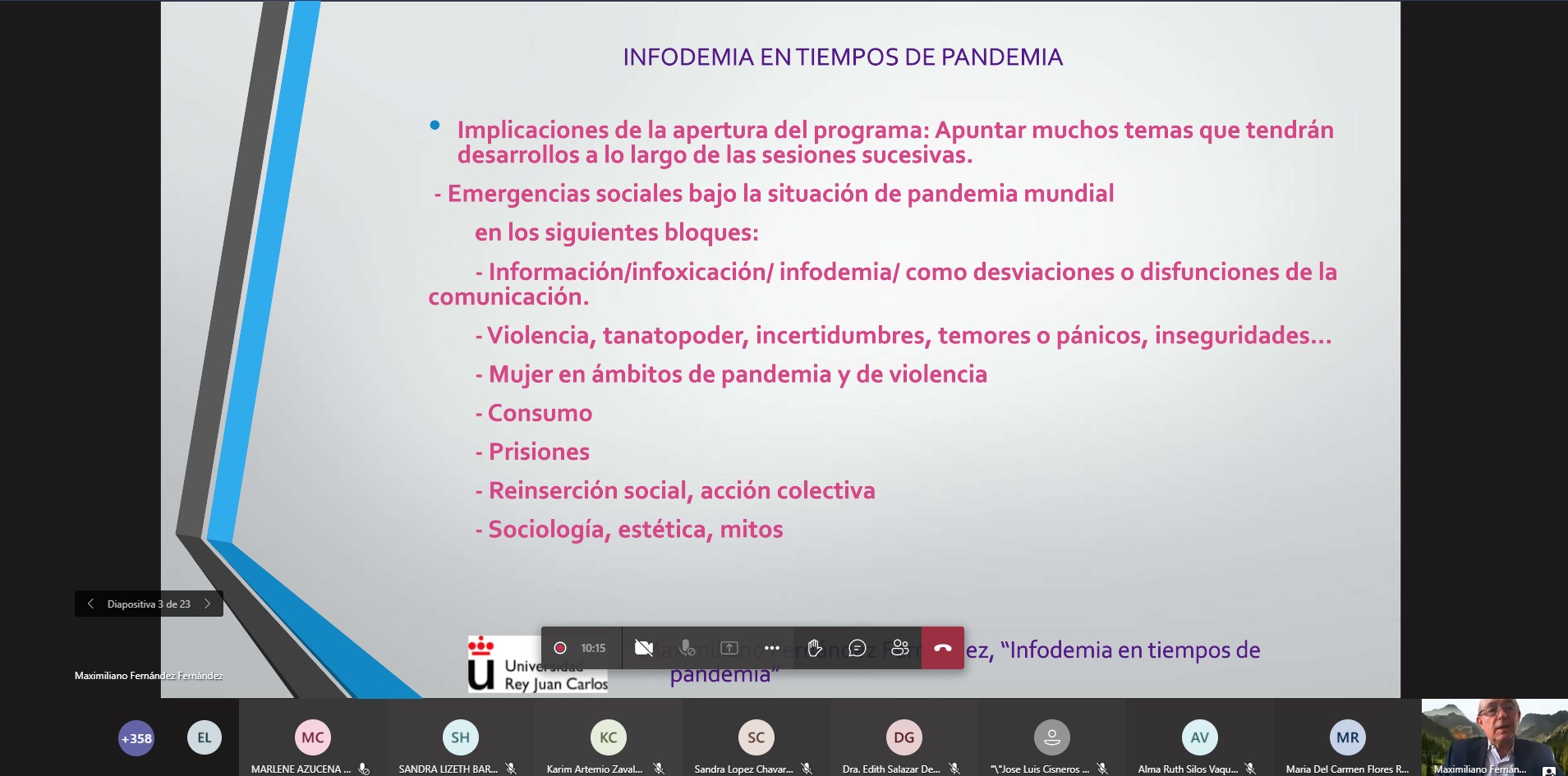 El evento se llevó a cabo de manera virtual a través de la plataforma Microsoft Teams e inició con la conferencia “Infodemía en tiempos de pandemia” a cargo del profesor titular del área de Periodismo del departamento de Ciencias de la Comunicación y Sociología de la Universidad Rey Juan Carlos de España, Dr. Maximiliano Fernández Fernández.