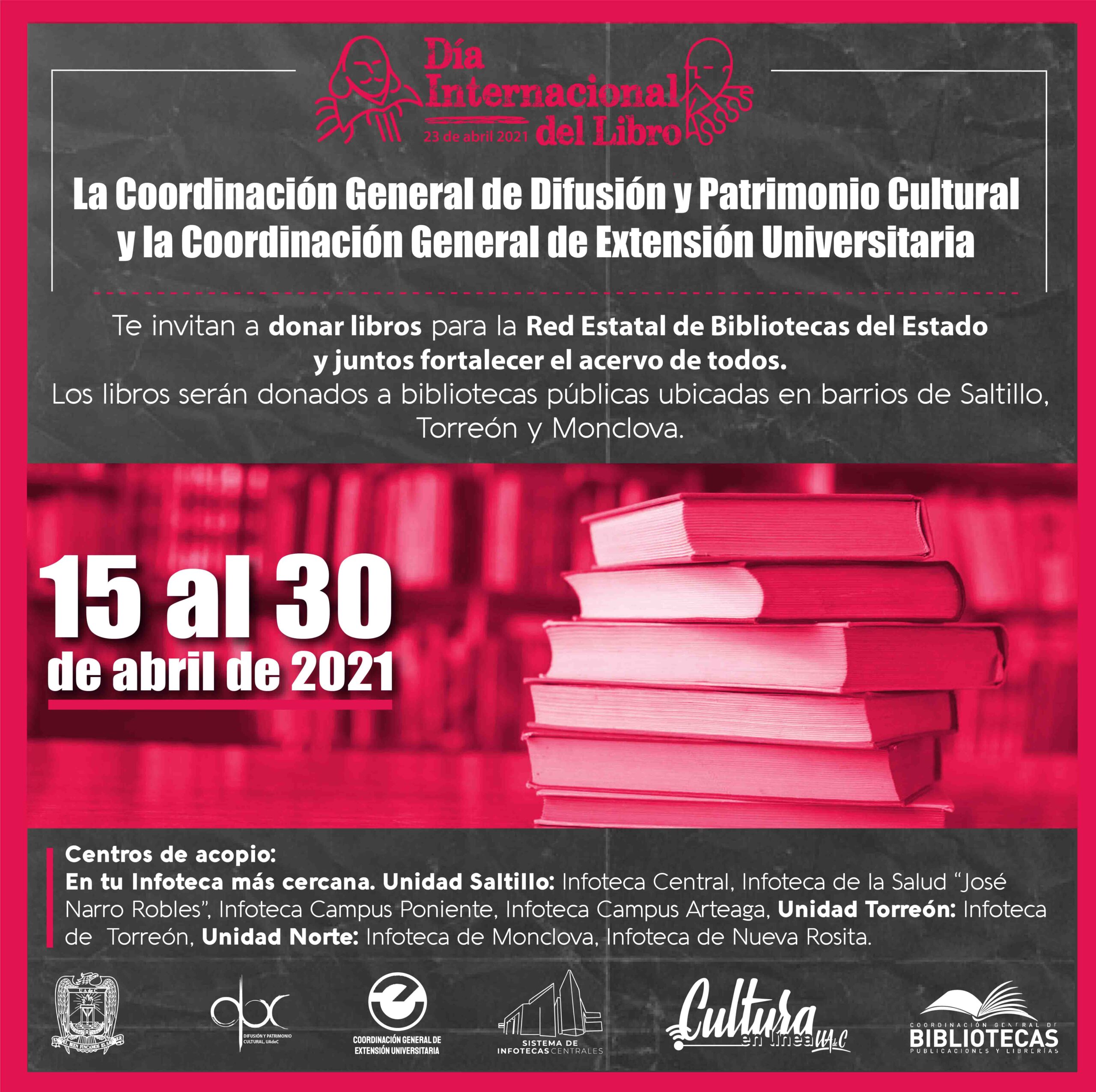 La Coordinaciones Generales de Difusión y Patrimonio Cultural y de Extensión Universitaria, convocan a la colecta de donación de libros para la Red Estatal de Bibliotecas del Estado y fortalecer el acervo para donarlo a las bibliotecas públicas en Barrios de Saltillo, Torreón y Monclova.
