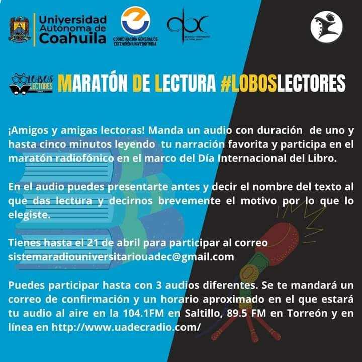 Más información en las páginas de Facebook de Difusión Cultural https://www.facebook.com/dpc.uadec/ en radio universidad Torreón https://www.facebook.com/XHUCT89.5FM, Radio Universidad Saltillo https://www.facebook.com/104.1RadioUniversidad y las Infotecas https://www.facebook.com/InfotecaCU, https://www.facebook.com/InfotecaSalud