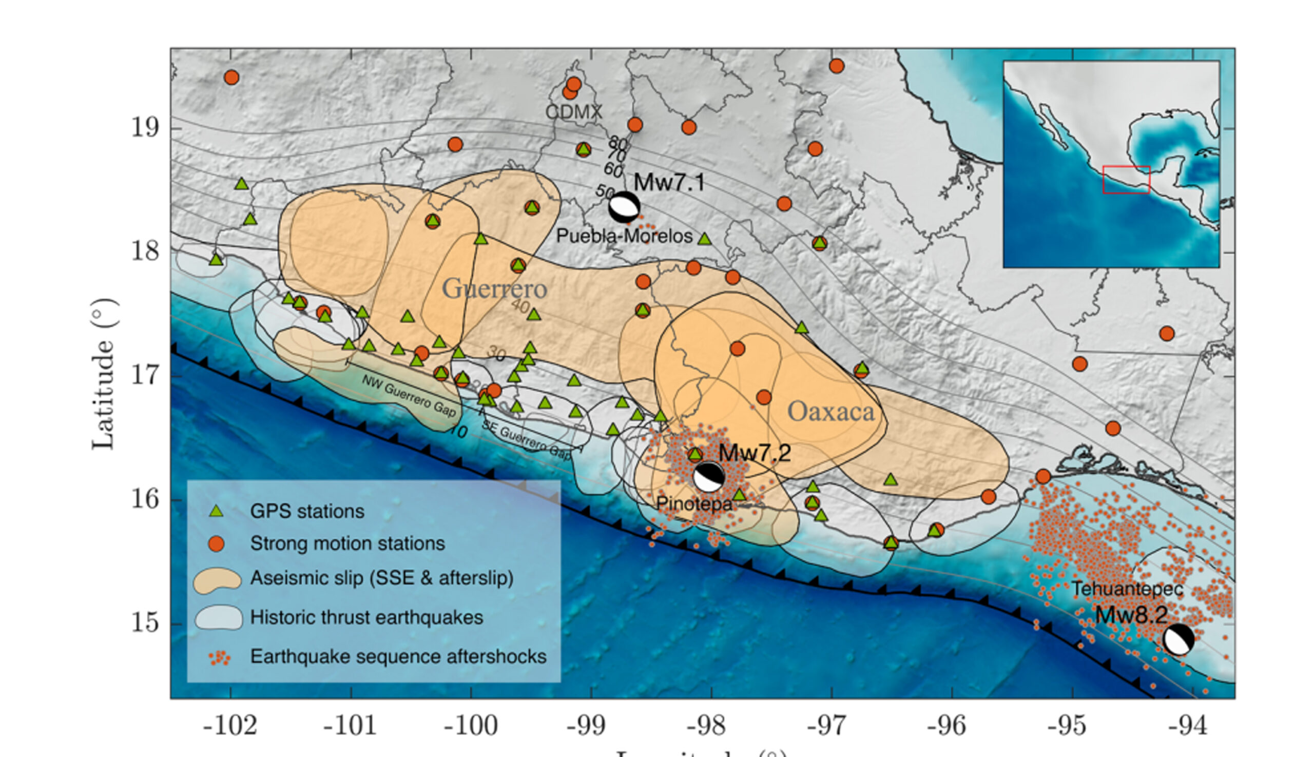 Otra observación extraordinaria reportada en el estudio es que el gran terremoto de Tehuantepec del 7 de septiembre de 2017 (magnitud 8.2) perturbó fuertemente el ciclo de los sismos lentos a escala regional, tanto en Guerrero como en Oaxaca, provocando una sucesión extraordinaria de sismos lentos que a su vez generaron los terremotos de Puebla-Morelos, que devastó la Ciudad de México y sus alrededores el 19 de septiembre de 2017; y el de Pinotepa Nacional, el 16 de febrero de 2018.