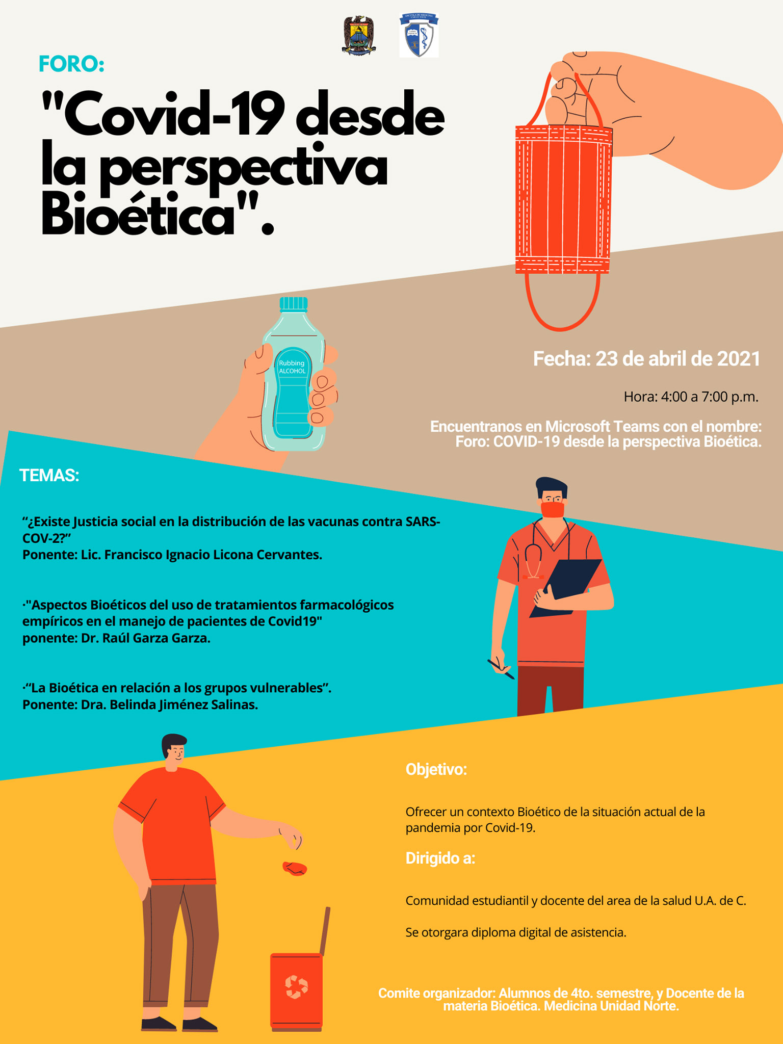 El evento está dirigido a la comunidad estudiantil y docente del área de la salud de la UA de C, sin embargo el acceso está abierto para el público en general; la actividad tiene por objetivo ofrecer un contexto bioético de la situación actual de la pandemia por el coronavirus.