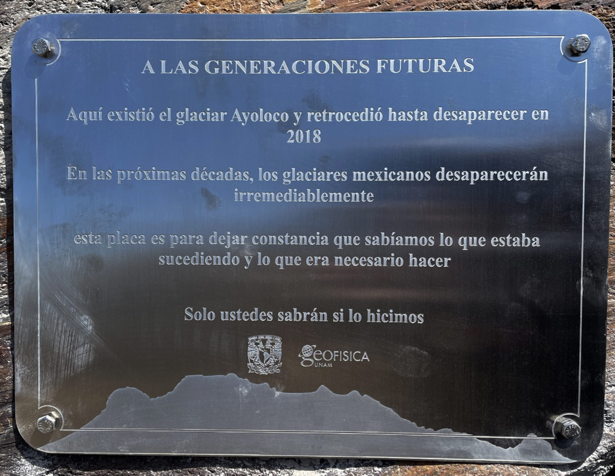 “A las generaciones futuras: Aquí existió el glaciar Ayoloco y retrocedió hasta desaparecer en 2018. En las próximas décadas los glaciares mexicanos desaparecerán irremediablemente. Esta placa es para dejar constancia de que sabíamos lo que estaba sucediendo y lo que era necesario hacer. Solo ustedes sabrán si lo hicimos”.