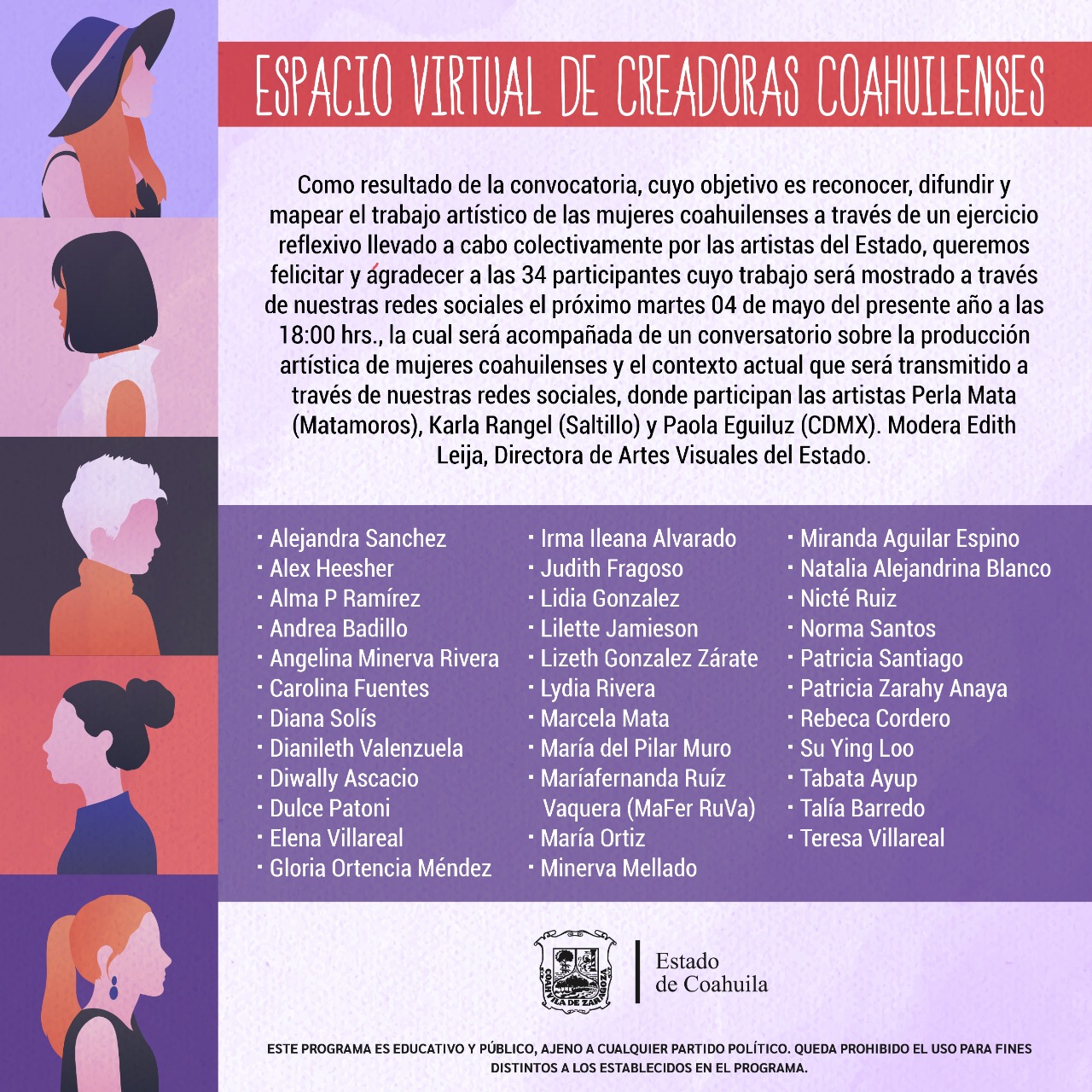 Como resultado de la convocatoria realizada por la Secretaría de Cultura del Estado (SC) “Espacio Virtual de Creadoras Coahuilenses”, será mostrado el trabajo de 34 creadoras coahuilenses.