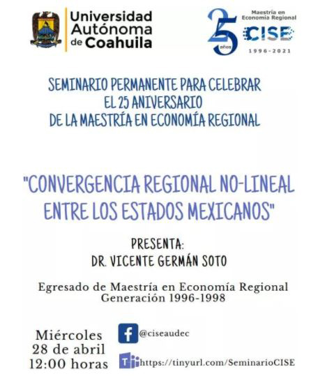 En el marco del Seminario Permanente para celebrar el 25 aniversario de la Maestría en Economía Regional, el Centro de Investigaciones Socioeconómicas (CISE) de la Universidad Autónoma de Coahuila, convoca a la conferencia “Convergencia Regional no-lineal entre los estados mexicanos” este miércoles 28 de abril a las 12:00 horas, a través de Microsoft Teams y por el Facebook Live de @ciseuadec.
