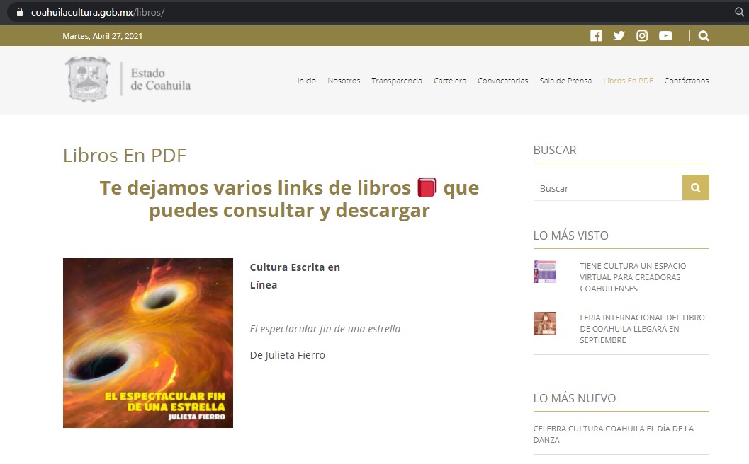 La Secretaría de Cultura coahuilense (SC) dio a conocer que continúa vigente dentro de su página de internet https://coahuilacultura.gob.mx/libros-en-pdf/ el acceso gratuito para diferentes títulos literarios.