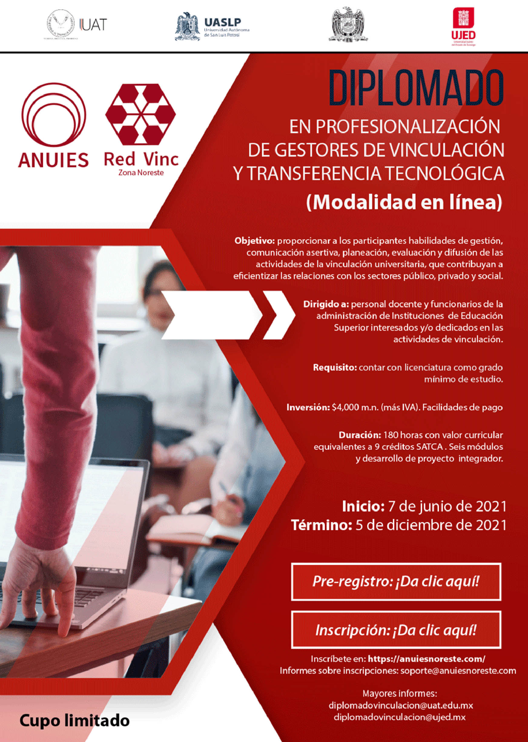 El diplomado iniciará el 7 de junio y concluirá el 5 de diciembre de 2021; para inscribirse ingresar a la página https://anuiesnoreste.com/; para más información escribir a los correos soporte@anuiesnoreste.com, diplomadovinculacion@uat.edu.mx y diplomadovinculacion@uajed.mx o bien comunicarse a la Coordinación General de Vinculación e Innovación Productiva de la UA de C a los teléfonos (844) 410 1441, (844) 410 1543 y (844) 481 6557. (EL HERALDO)