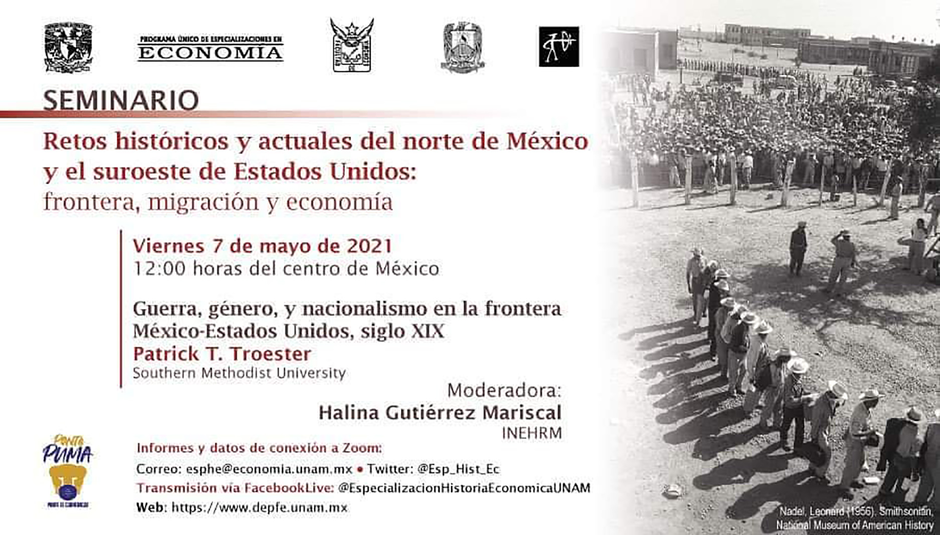 El viernes 7 de mayo a las 12:00 horas se impartirá la conferencia “Guerra, género y nacionalismo en la frontera México-Estados Unidos Siglo XIX”, a cargo de Patrick T. Troester de la Universidad Metodista del Sur, contando con la participación como moderadora de Halina Gutiérrez del Instituto Nacional de Estudios Históricos de las Revoluciones de México.