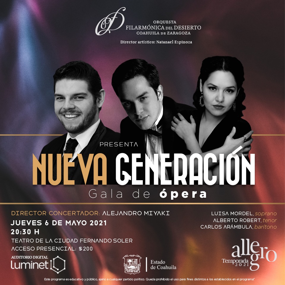La Secretaría de Cultura de Coahuila (SC), a través de la Orquesta Filarmónica del Desierto (OFDC) y el Teatro de la Ciudad Fernando Soler, se complace en presentar este 6 de mayo su primer concierto ExtraTemporada: la Gala Operística Nueva Generación.