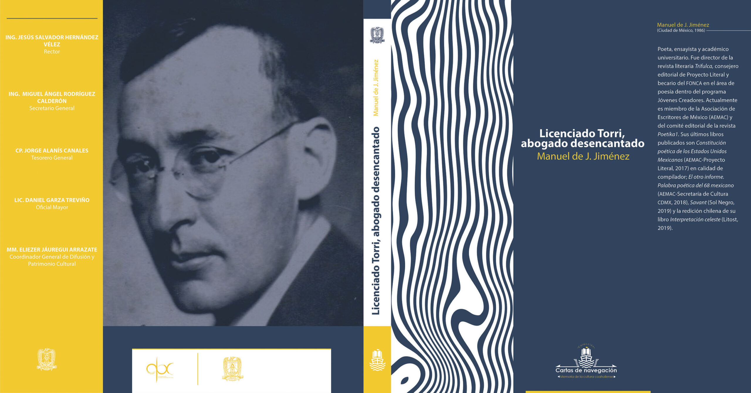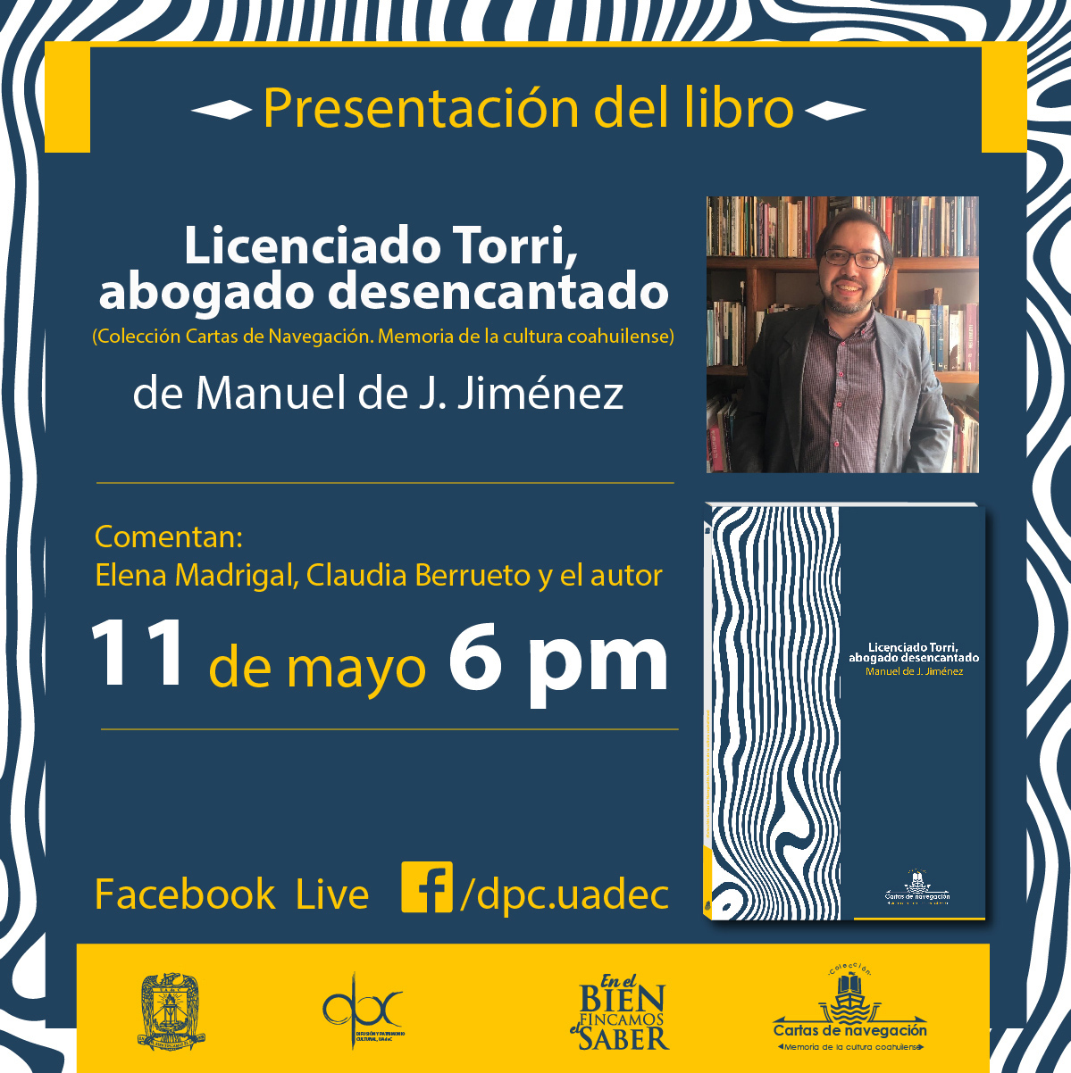 Como parte del programa “Cultura en línea UAdeC”, la Coordinación General de Difusión y Patrimonio Cultural de la Universidad Autónoma de Coahuila, invita a la presentación del libro “Licenciado Torri, abogado desencantado” del escritor Manuel de Jesús Jiménez, que se llevará a cabo el martes 11 de mayo a las 18:00 horas, a través del Facebook Live: @dpc.uadec.