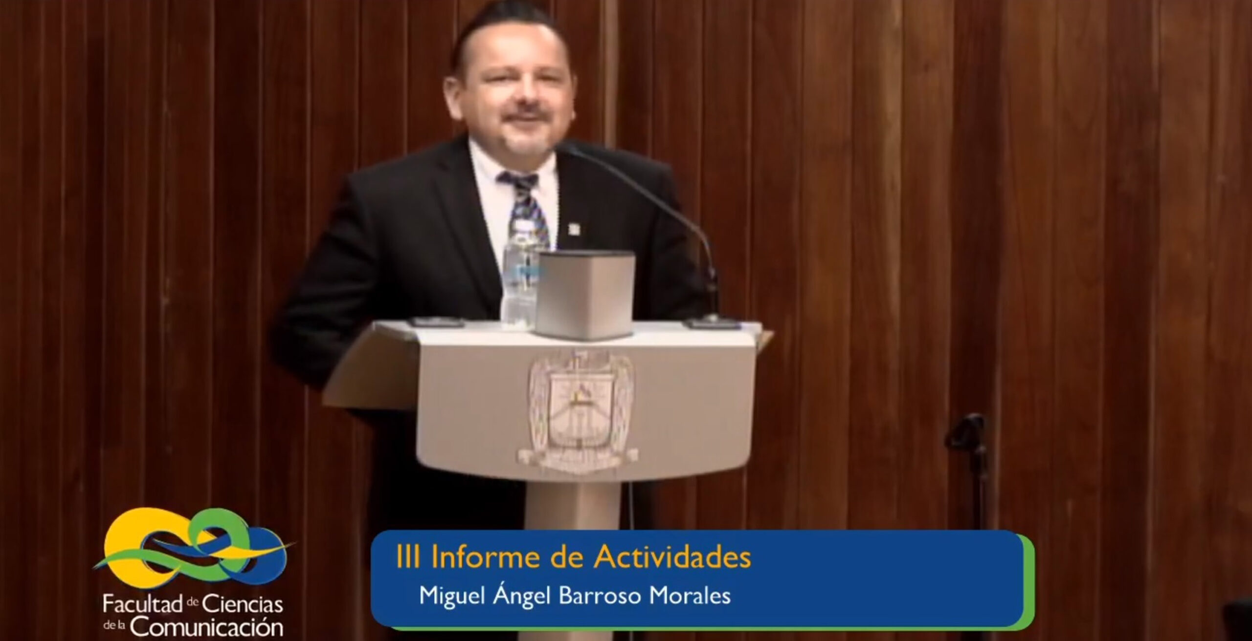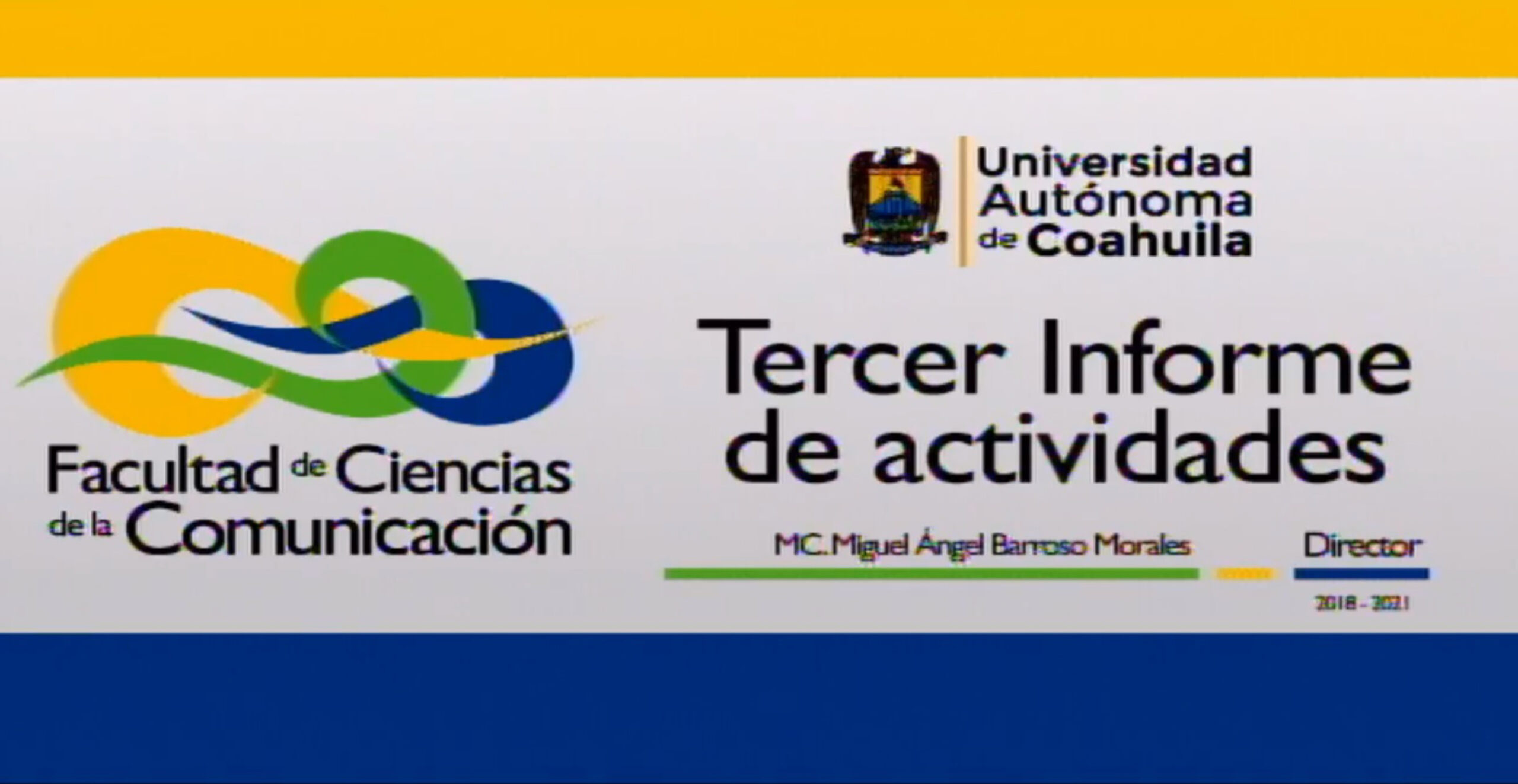 Al cumplir con la política de transparencia y la rendición de cuentas en la Universidad Autónoma de Coahuila, el director de la Facultad de Ciencias de la Comunicación, Miguel Ángel Barroso Morales, rindió este viernes su tercer informe de actividades correspondientes al periodo 2020-2021.