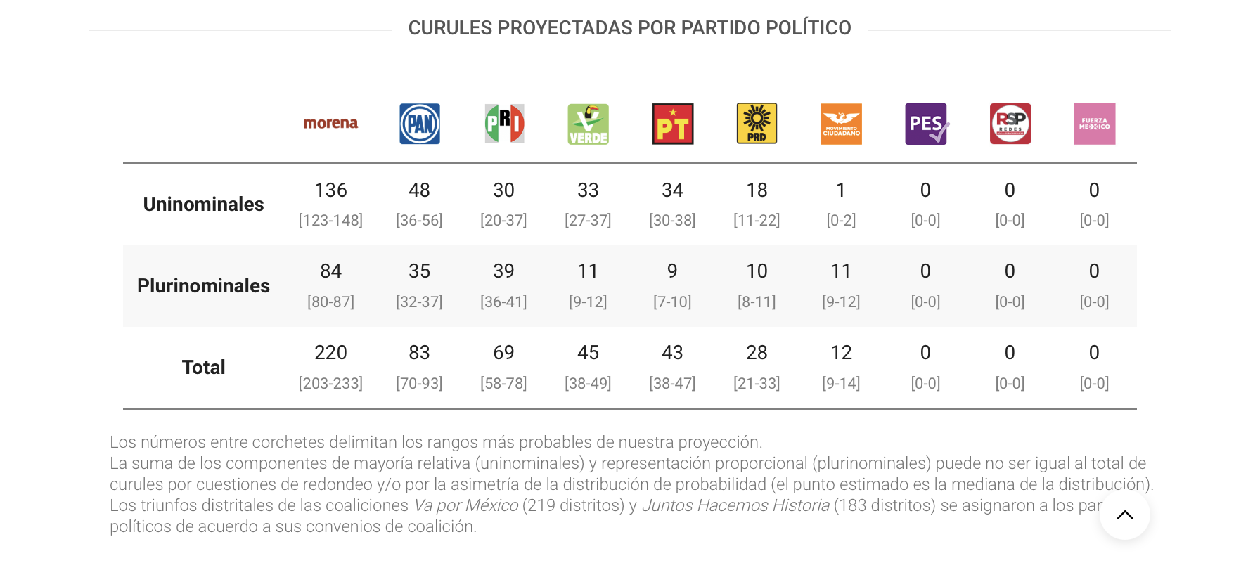 De acuerdo con el sitio oraculus.mx , en base a un modelo que agrega los resultados de las principales encuestas de intención de voto para diputados federales, a partir de dichas encuestas y de patrones históricos de votación, se estima la proyección de la composición de la Cámara de Diputados de la siguiente manera: