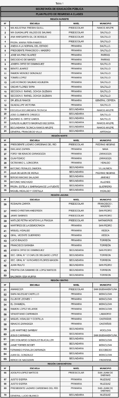 Torreón.- Un total de 70 escuelas están inscritas en la Prueba Piloto para el Regreso a Clases, informó el gobernador Miguel Ángel Riquelme Solís este lunes durante la reunión de la Mesa de Trabajo del Sector Educativo.