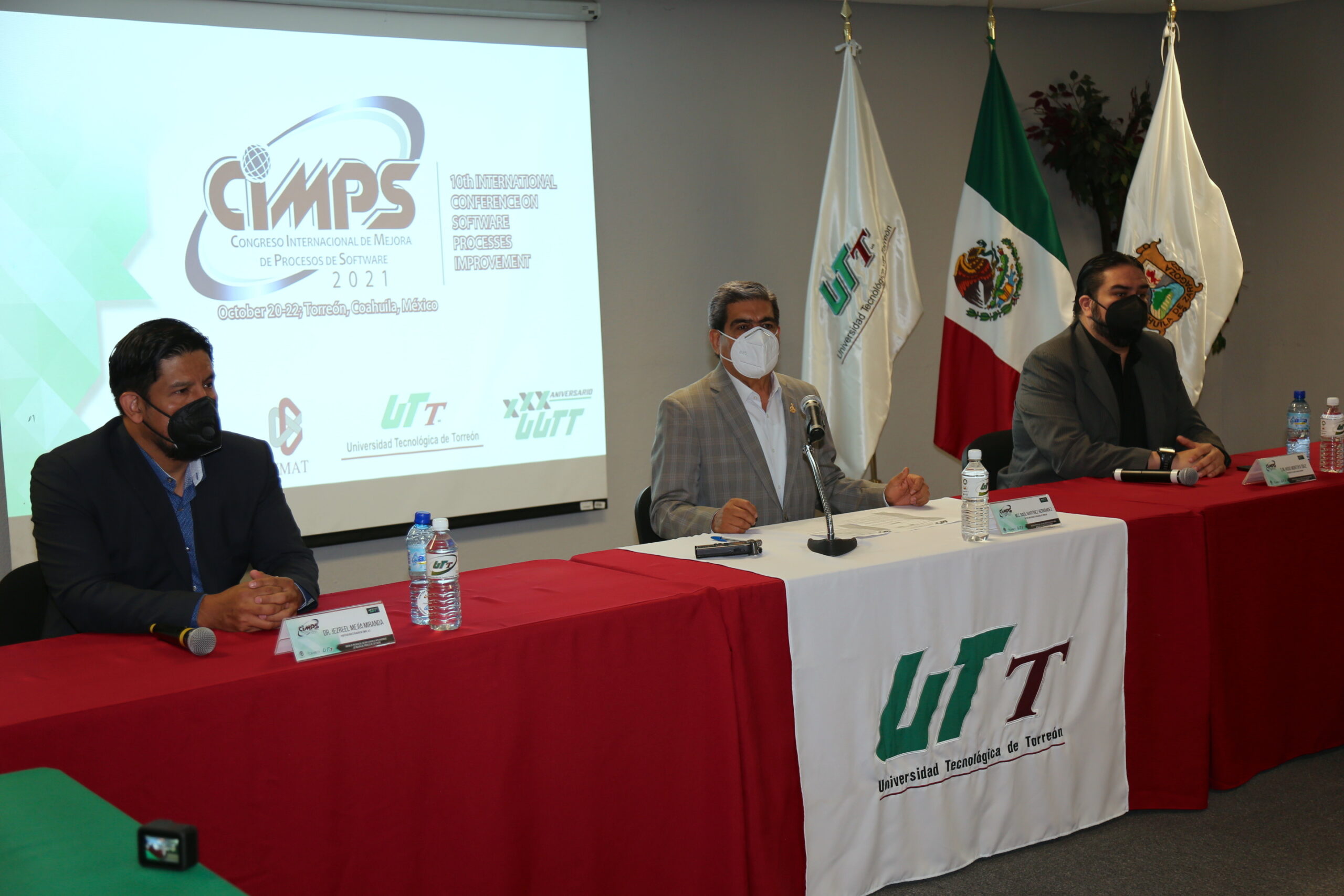 La conferencia de prensa contó con la presencia de las autoridades que llevan la organización del CIMPS 2021, que son el rector de la UTT, Raúl Martínez Hernández; Hugo Montoya Díaz, presidente de la Cámara Nacional de la Industria Electrónica, de Telecomunicaciones y Tecnologías de la Información en Coahuila y Durango; y Jezreel Mejía Miranda, presidente general del CIMPS.