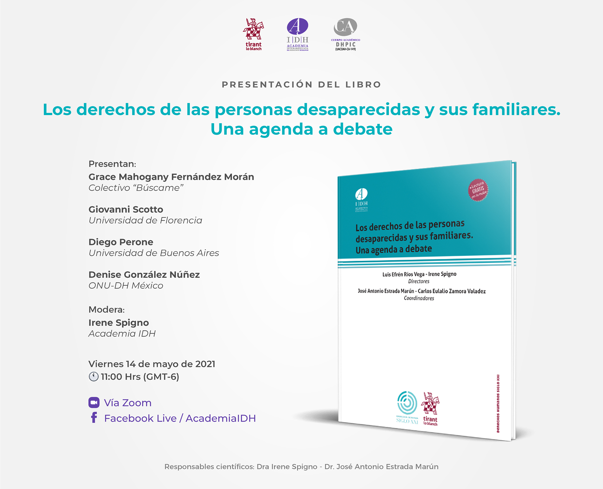 La Academia Interamericana de Derechos Humanos de la Universidad Autónoma de Coahuila, invita a la comunidad universitaria y público en general a la presentación del libro “Los derechos de las personas desaparecidas y sus familiares. Una agenda a debate”, este viernes 14 de mayo a las 11:00 horas por medio de Zoom y trasmisión en vivo por el Facebook: @AcademiaIDH.