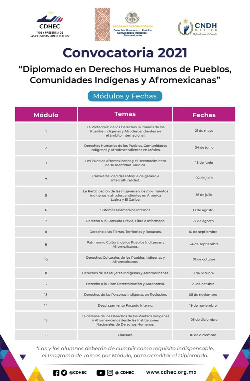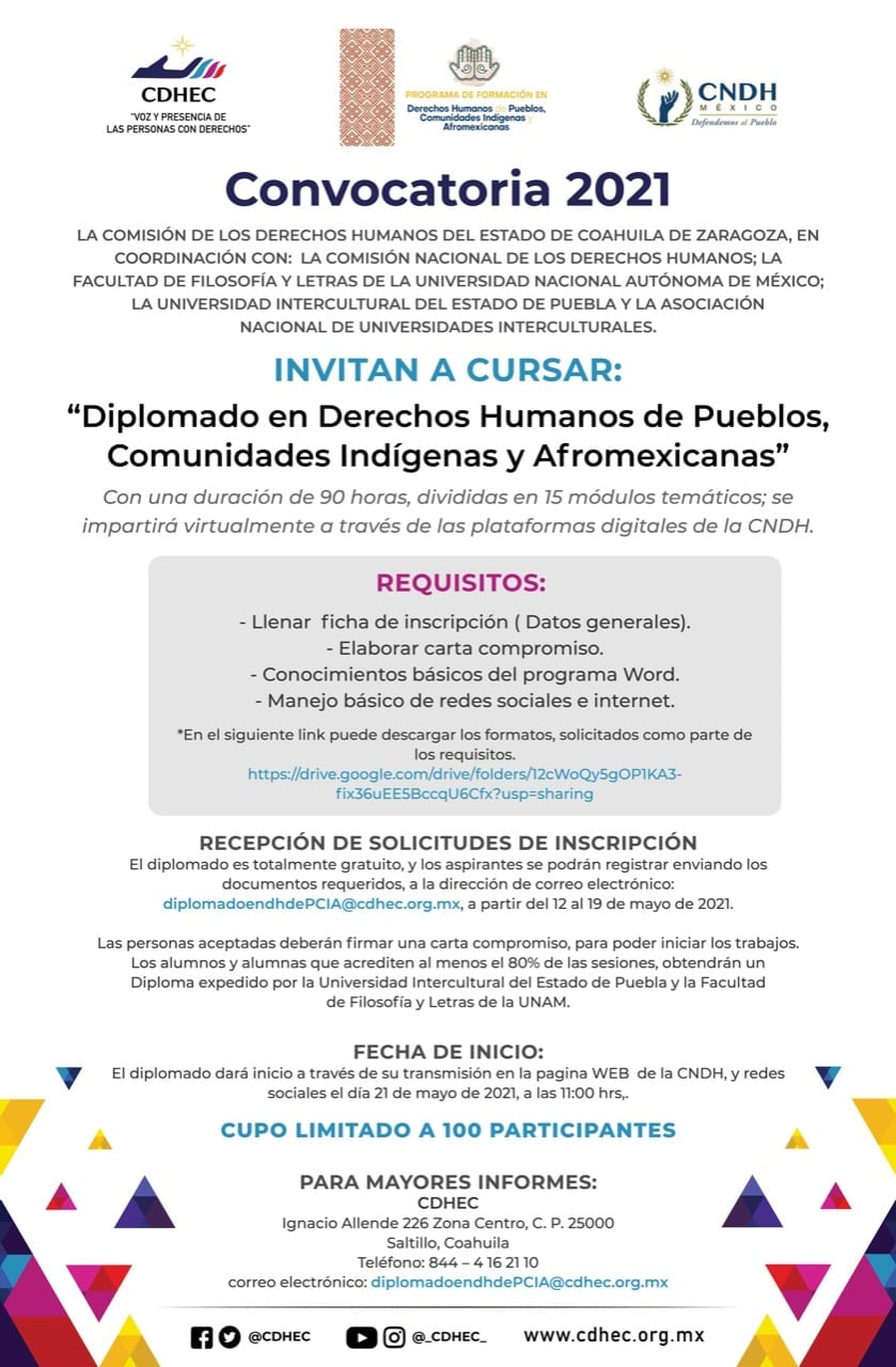 En sinergia con la Comisión Nacional de los Derechos Humanos (CNDH) y la Universidad Nacional Autónoma de México (UNAM), la Comisión de los Derechos Humanos del Estado de Coahuila (CDHEC) oferta, de manera gratuita y virtual, para el público en general, su Diplomado en Derechos Humanos de Pueblos, Comunidades Indígenas y Afromexicanas, que iniciará el próximo 21 de mayo, a las 11:00 de la mañana, por medio de la página web de la CNDH.