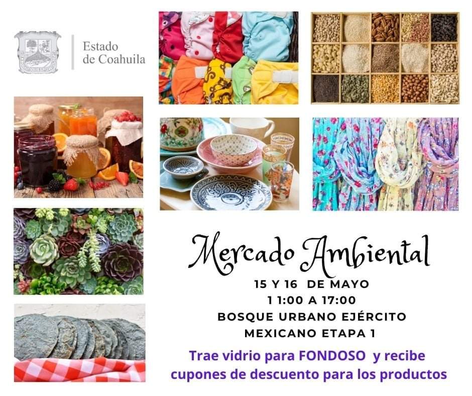 La Secretaría del Medio Ambiente de Coahuila llevará a cabo este sábado y domingo en instalaciones del Bosque Urbano Ejército Mexicano un mercado ambiental, en el que los saltillenses podrán encontrar diferentes tipos de productos y servicios diseñados para cuidar y preservar el medio ambiente.