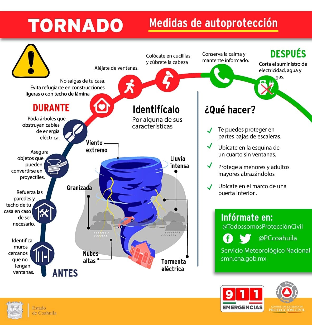 Manténgase informado por los medios oficiales de comunicación y atento a los avisos que emita el Servicio Meteorológico Nacional y la Subsecretaría de Protección Civil de Coahuila.